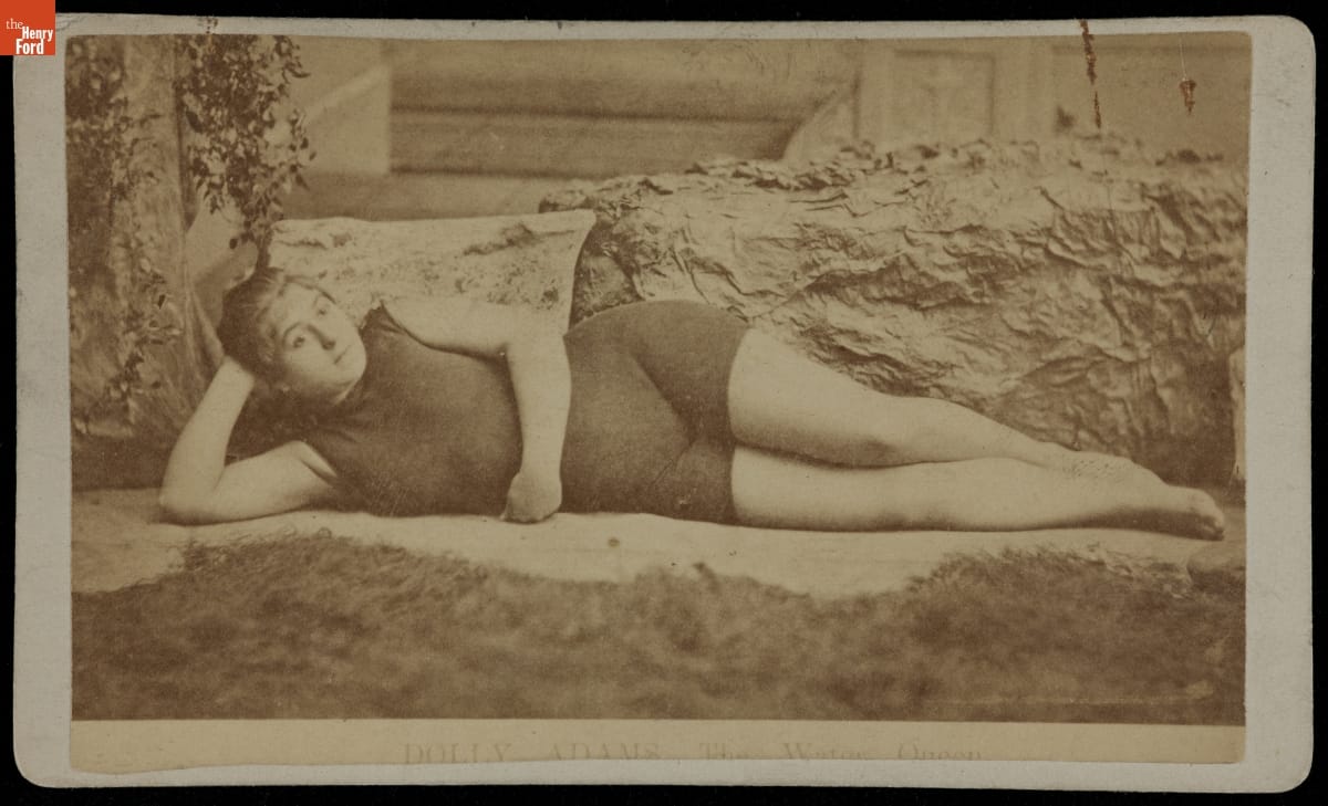 Circus performer Dolly Adams, nicknamed "The Water Queen," posed in her bathing suit for this carte-de-visite around 1880. The carte-de-visite was a small photographic print on cardboard stock made by professional photographers. People exchanged and collected cartes-de-visite, popular in the United States from the Civil War in the 1860s through the 1880s, to help them remember family and celebrities.