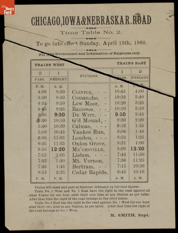 Chicago, Iowa & Nebraska Rail Road Time Table, 1860