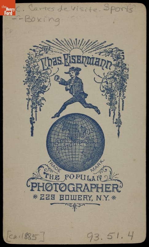 This unidentified "tattooed man" with patriotic tattoos was photographed by Charles Eisenmann in his Bowery district studio. Eisenmann captured the eclectic mix of people who frequented the Bowery, including circus performers like this -- a likely client of the area's infamous tattoo parlors. Eisenmann's images were reproduced for sale in the form of cabinet cards, popular among the middle class.