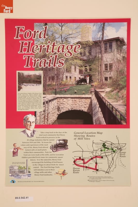 In the early 1920s, Henry Ford began locating small hydroelectrically powered plants in rural southeast Michigan. These "Village Industries" employed local people, who could maintain farms while working at the factory, and produced parts for Ford vehicles. Most of the industries closed soon after World War II. Forty years later, the sites were incorporated into a pair of Ford Heritage Trails.