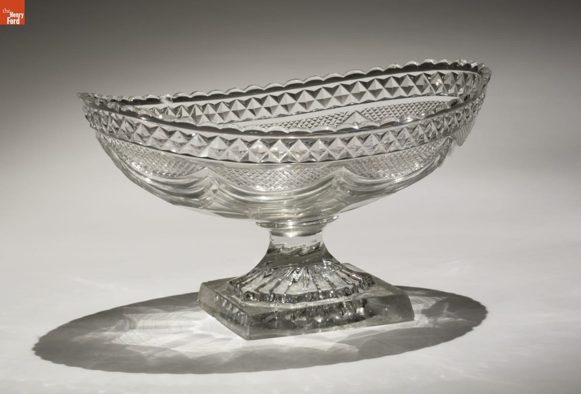 Oval compotes were used as centerpieces on elaborately laid dining room tables in the late 18th and early 19th centuries. They were usually filled to overflowing with fruit or flowers to underscore the bounty that dinner guests were about to receive. The glass is cut in diamond patterns to capture and disperse the prismatic patterns of light in a candle lit room.