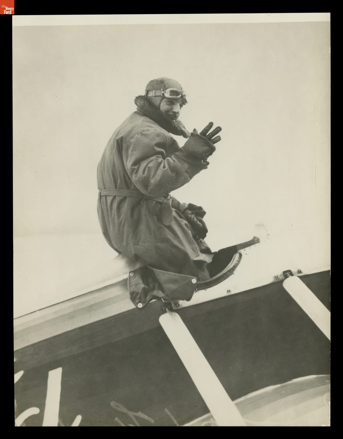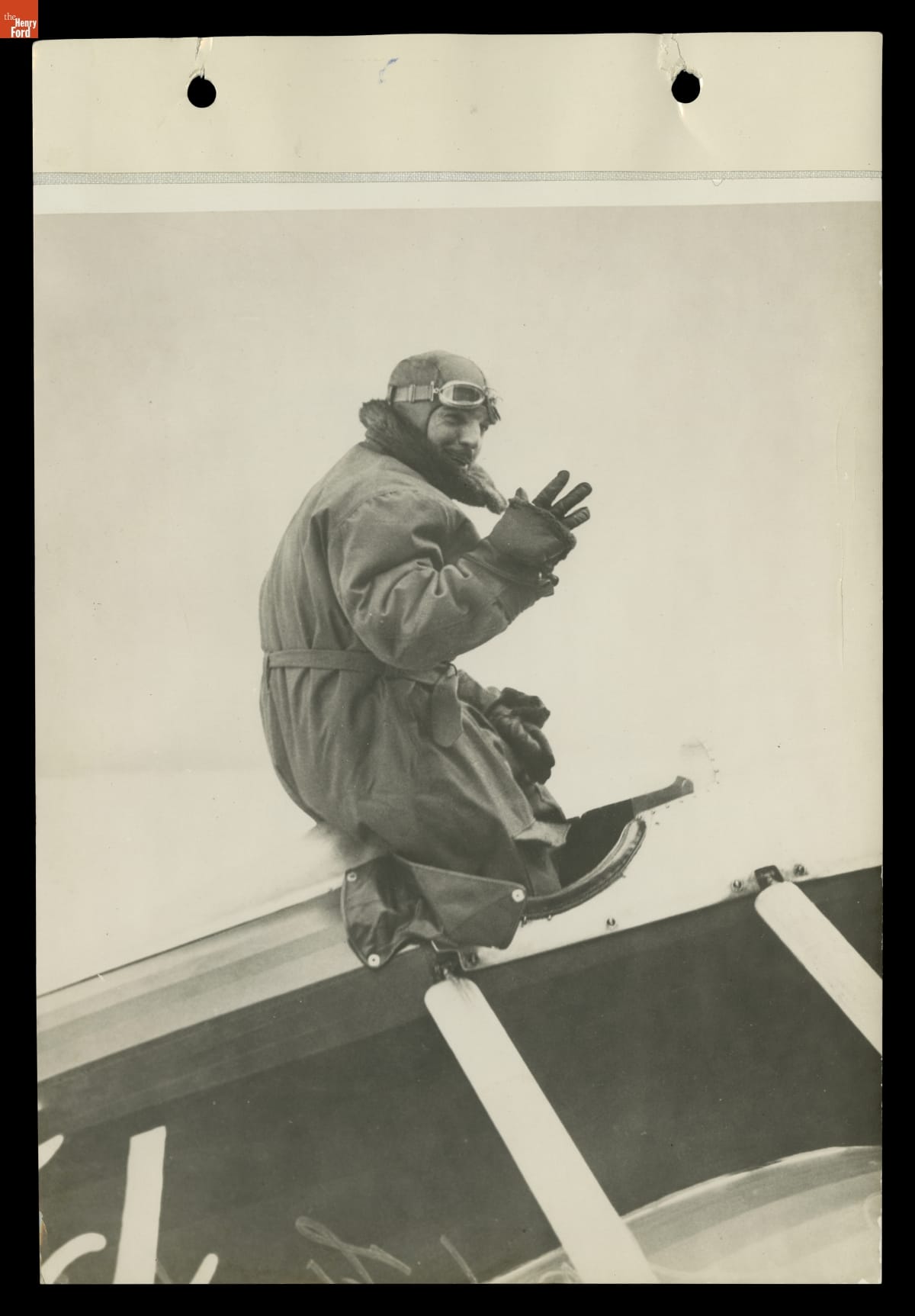 Test pilot Harry Brooks waved from a Ford Flivver airplane circa 1925. The Flivver was Henry Ford's attempt to create a small, affordable airplane that almost anyone could fly -- a Model T for the sky. Three or four prototypes were built, but Ford abandoned the project after Brooks died in a Flivver crash near Melbourne, Florida, in 1928.