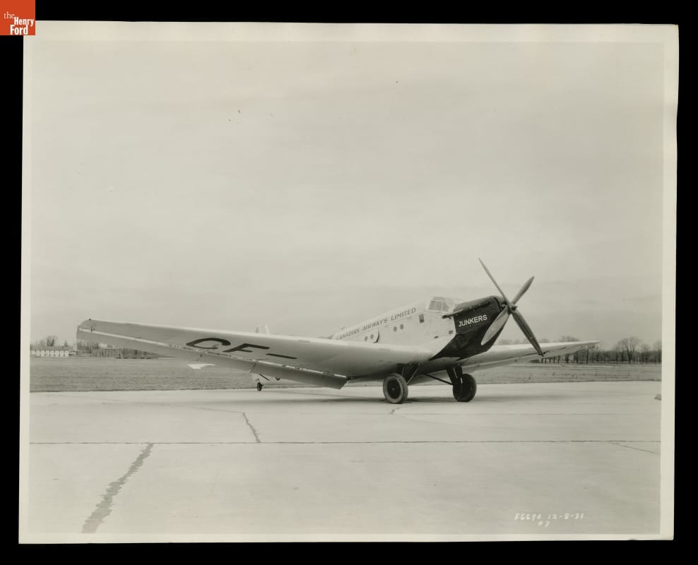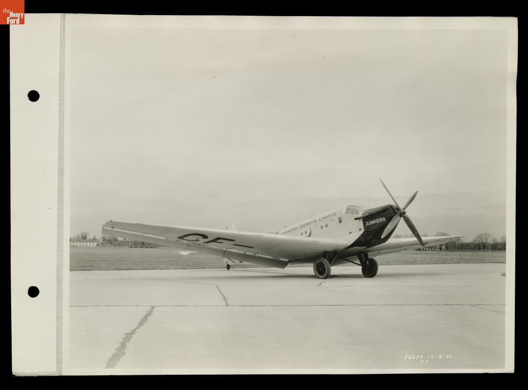 German engineer Hugo Junkers pioneered the construction of all-metal airplanes while building craft for the German military during World War I. Junkers built his planes from duralumin, a strong but lightweight aluminum alloy. After the war, Junkers turned to civilian production. This Junkers airplane, lettered for Canadian Airways Limited, paid a visit to Ford Airport in 1931.