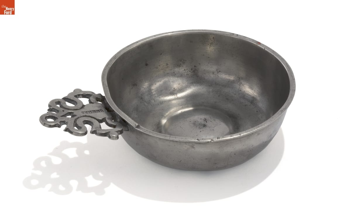 Porringers have many uses. They could be used to mix or serve food. People ate meals or drank wine, beer or other beverages from porringers. These small bowls have a flat decorative handle--sometimes two; and were made from silver, cast iron, pottery, or like this one, pewter. These versatile bowls served the needs of many 18th and 19th-century American households.