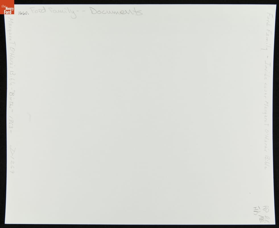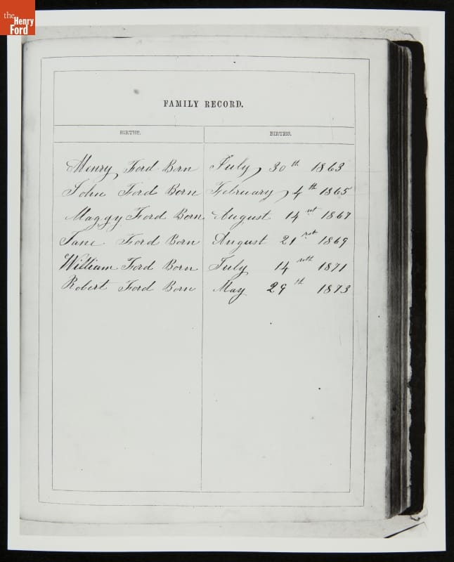 Many 19th-century Americans recorded births, deaths and marriages in family bibles. Subsequent generations sometimes add and update entries. The Ford family bible originally belonged to Margaret Ahern (or O'hern), Henry Ford's foster grandmother. It was passed down to Henry's sister, Margaret. Margaret later gave the bible to Henry. This page contains the birthdates for Henry and his siblings.