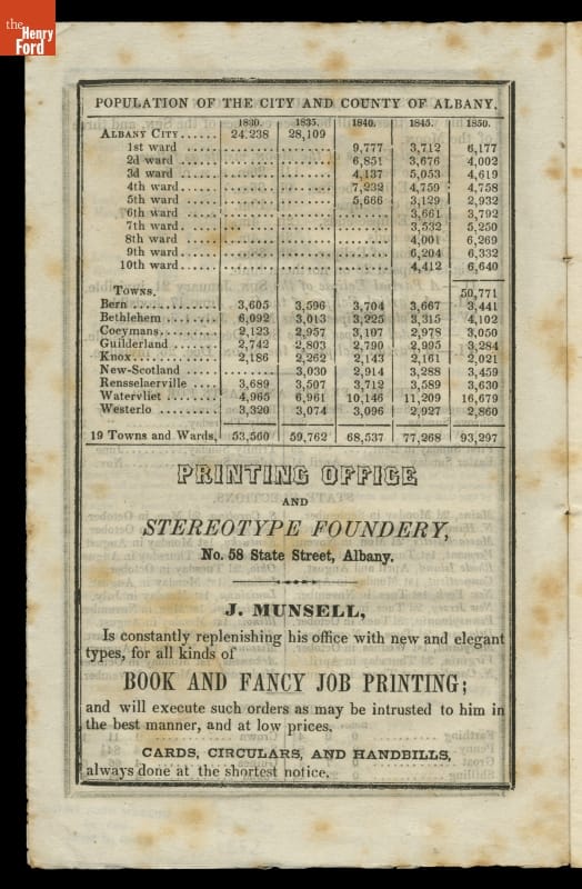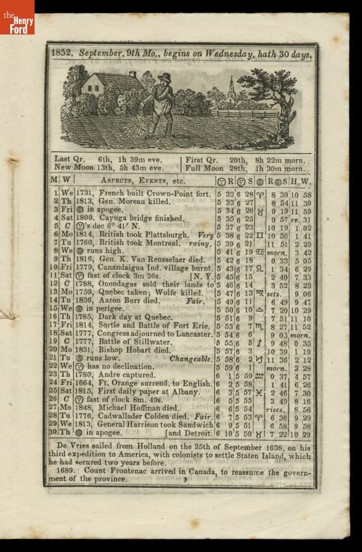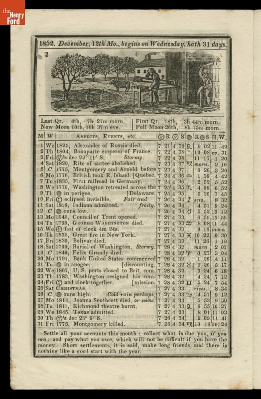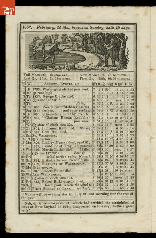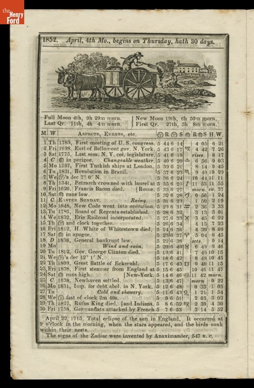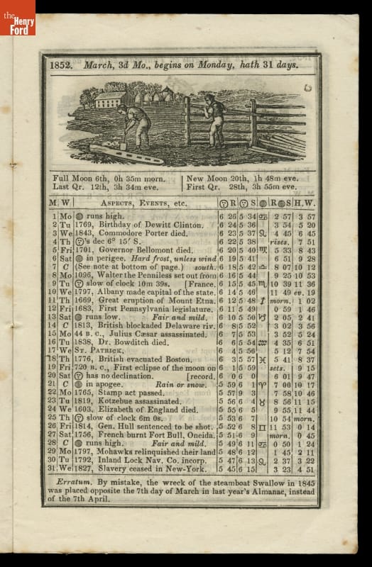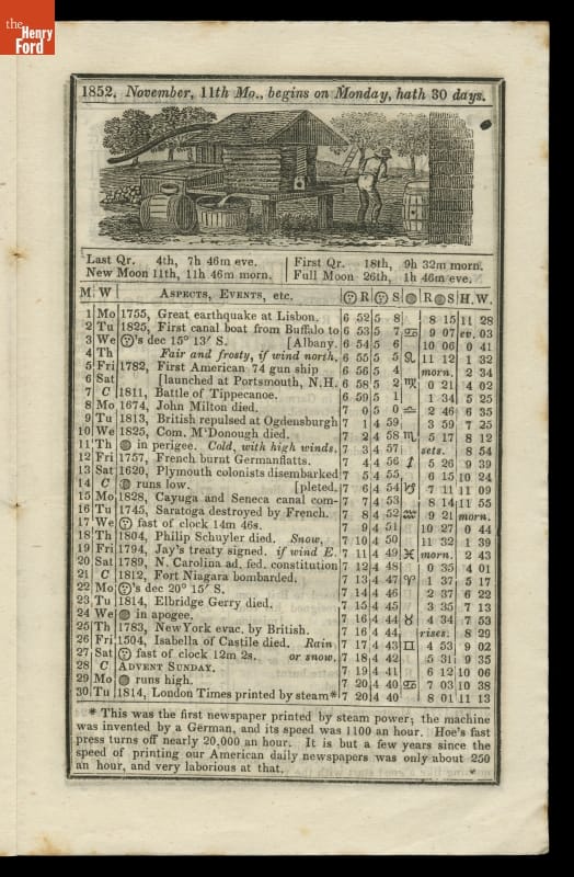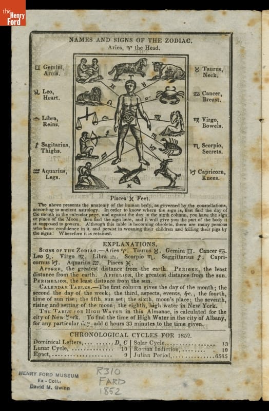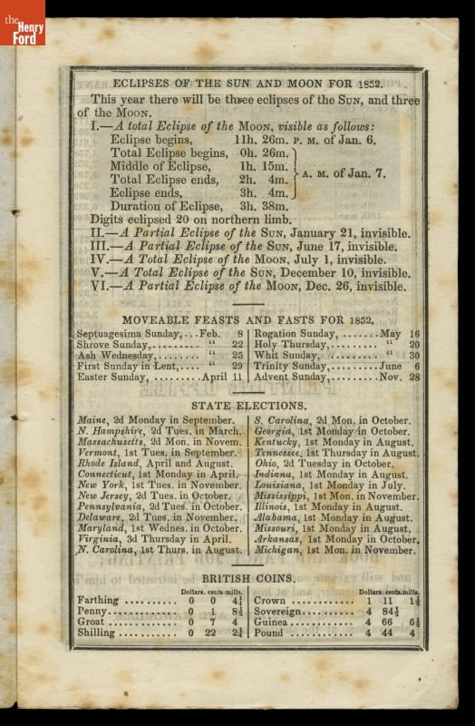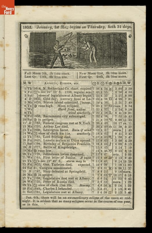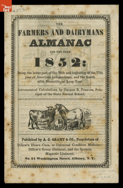 Almanacs contained practical information about the coming year. Readers normally found a calendar, weather predictions, tide schedules, and information related to agriculture, health, politics, astronomical events, and other matters. Interspersed were jokes and witty sayings. Publishers of this almanac touted its astronomical calculations by the principal of the New York State Normal School, perhaps to influence customers to choose this almanac.