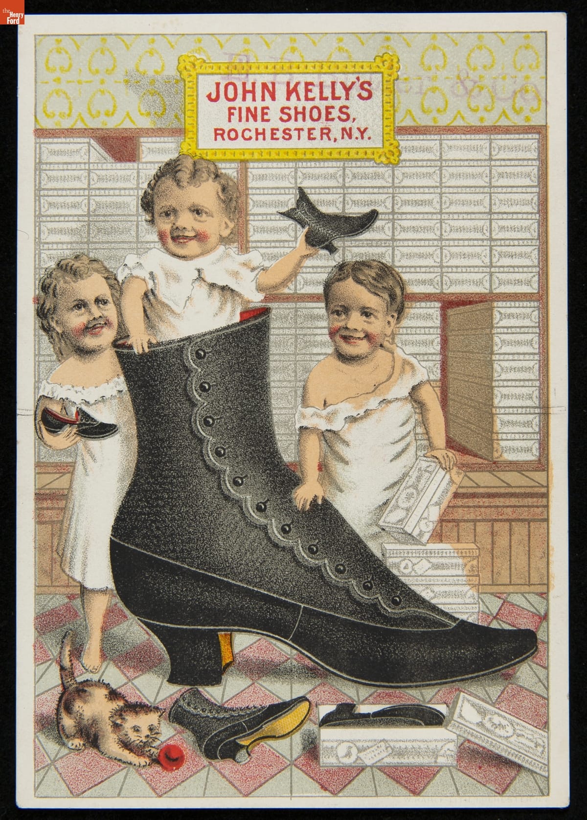As color printing gained momentum in the late 19th century, trade cards became a major means of advertising goods and services. Americans enjoyed and often saved the little advertisements found in product packages or distributed by local merchants. This trade card is for John Kelly's Fine Shoes.