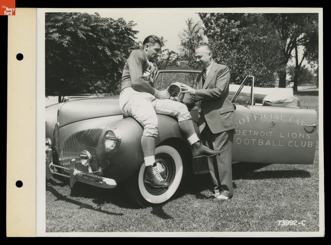 Football fans could thank Dearborn, Michigan, Ford dealers for presenting radio broadcasts of the 1940 Detroit Lions' season. Fans could tune into WJR each week to hear the play-by-play. In addition, dealers sponsored an August preseason show that featured news from the Lions' training camp and interviews with players. Photographs, like this one, helped promote local dealers and the Lions' games.