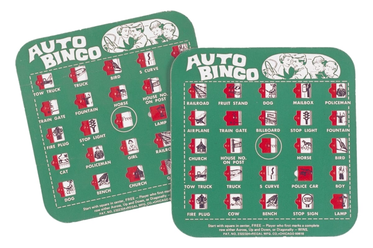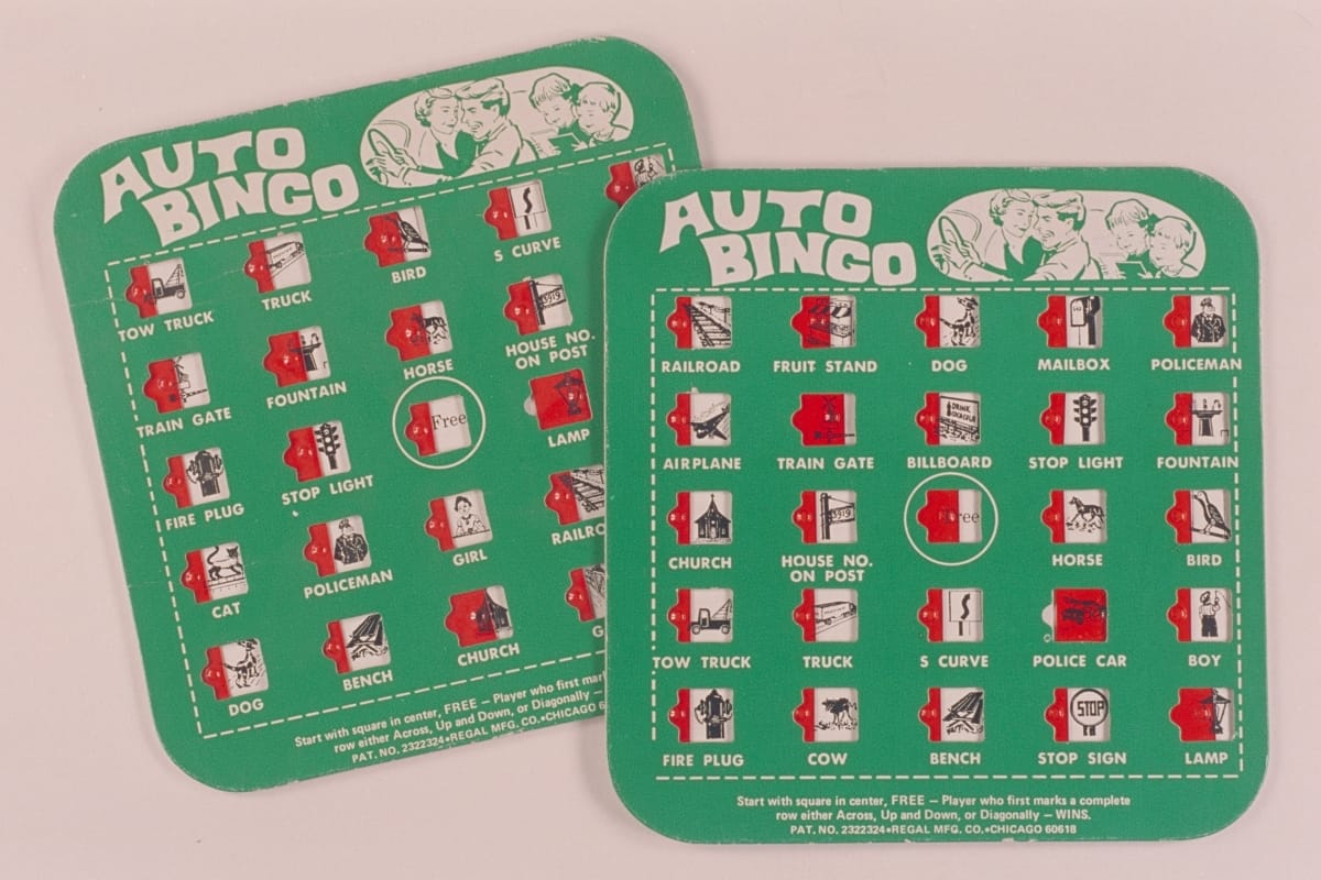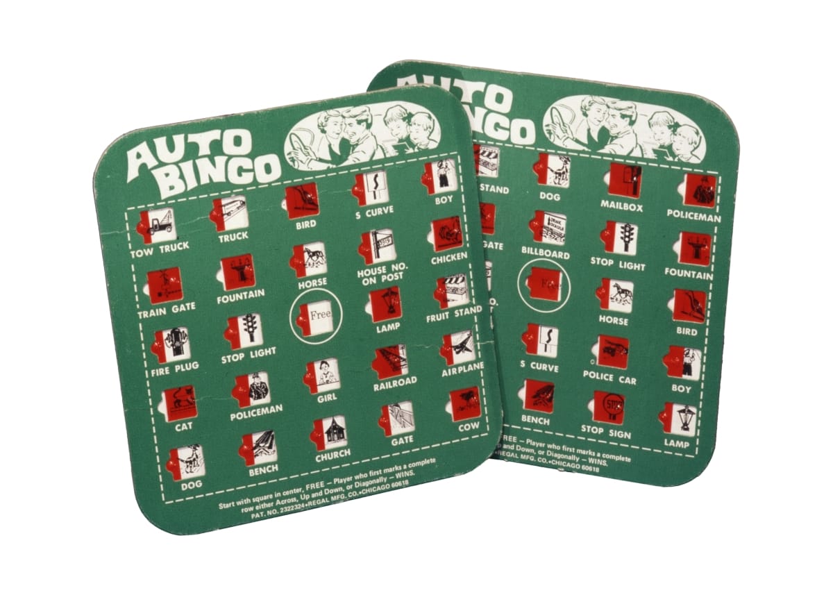 As the interstate highway system expanded and automobiles became more reliable, the distance of the average automobile trip lengthened. Families traveling long hours looked for ways to occupy restless children while on the road. "Auto Bingo," c. 1965, was one of the many travel games and novelties that appeared on the market in the 1950s and 1960s.