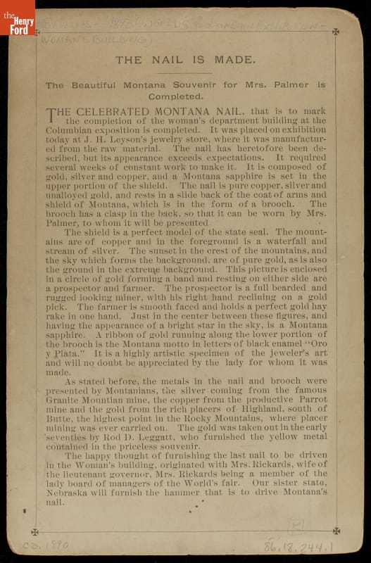 The Woman's Building at Chicago's 1893 World's Columbian Exposition recognized the contributions of women to society. The women's delegation from Montana offered a ceremonial gold nail to signify the building's completion. Jewelers fashioned a brooch with the nail and presented it to Bertha Palmer, President of the Exposition's Women's Department.