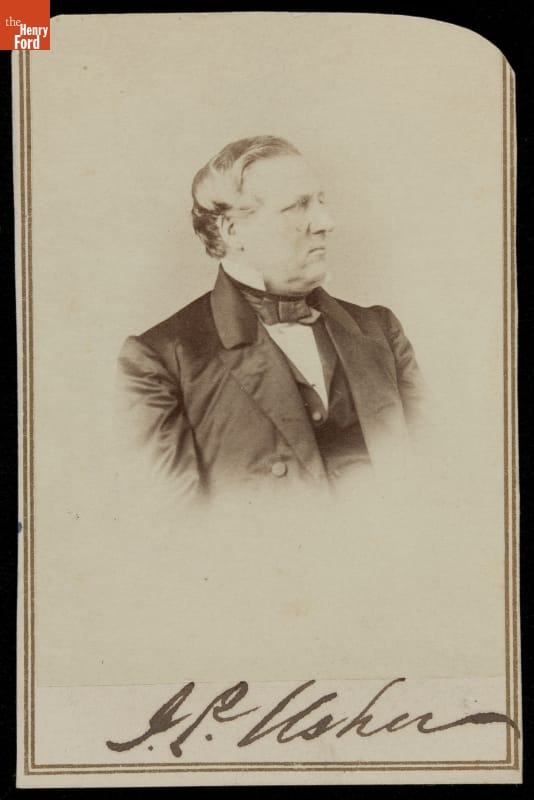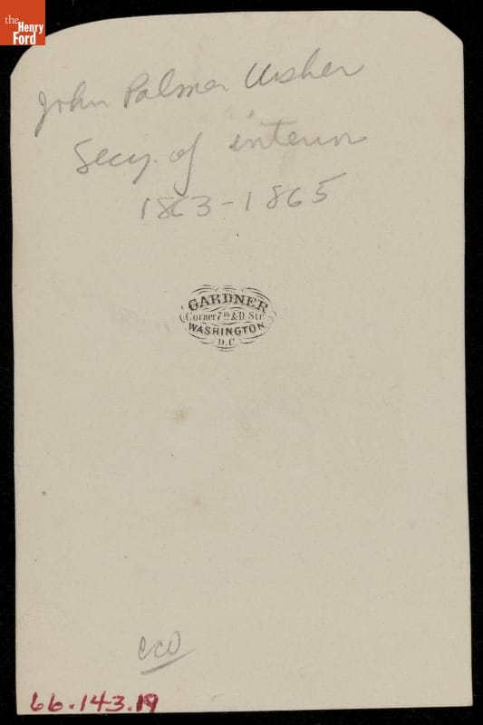 This autographed portrait carte-de-visite shows John Palmer Usher, Secretary of the Interior under Abraham Lincoln. The carte-de-visite was a small photographic print on cardboard stock made by professional photographers. People exchanged and collected cartes-de-visite, popular in the United States from the Civil War in the 1860s through the 1880s, to help them remember family and celebrities.