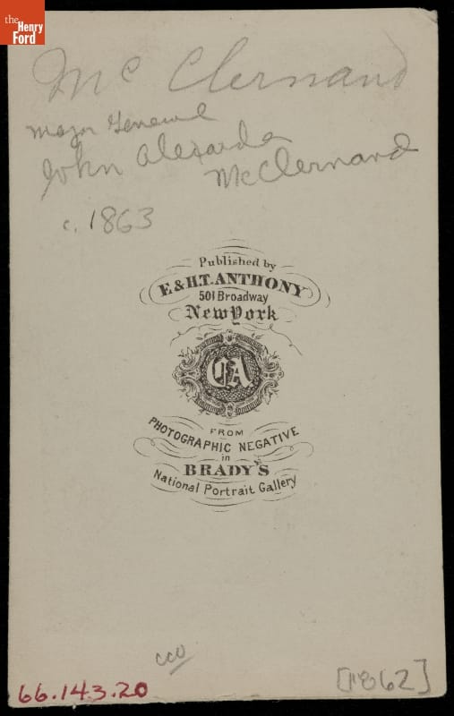 Cartes-de-visite, small, professionally made photographs on cardboard stock, remained popular in the United States from the Civil War in the 1860s through the 1880s. Many were given to friends and loved ones, but enterprising photographers also produced images of famous individuals to sell to the collecting-crazed public. Admired politicians or military officers, such as General John Alexander McClernand, were popular subjects.