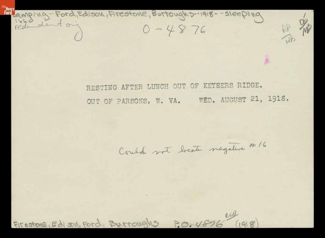 typed on back of image: RESTING AFTER LUNCH OUT OF KEYSERS RIDGE. / OUT OF PARSONS, W. VA. WED. AUGUST 21, 1918 / handwritten on back of image: could not locate negative #16 / O-4876