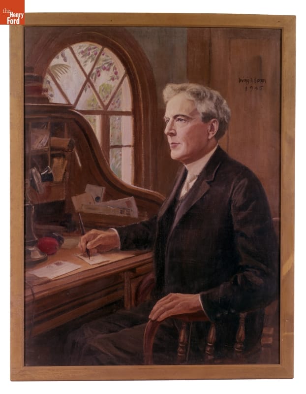 This painting depicts Luther Burbank, a horticulturalist known for inventing more than 800 plants. Irving Bacon, Henry Ford's favorite artist, apparently based this portrait of Burbank at work in his office on a photograph that Burbank's widow shared with Ford in 1928.