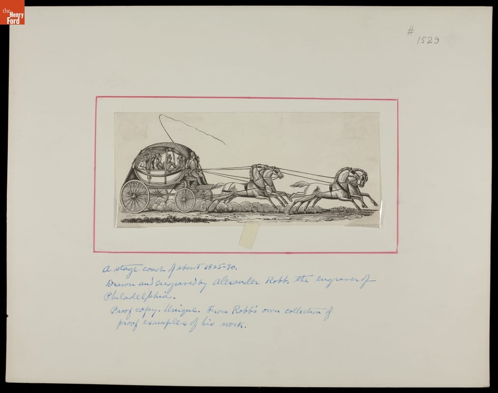 Description beneath: A stage coach of about 1825-30. Drawn and engraved by Alexander Robb, the engraver of Philadelphia. Proof copy. Unique.From Robb's own collection of proud examples of his work.