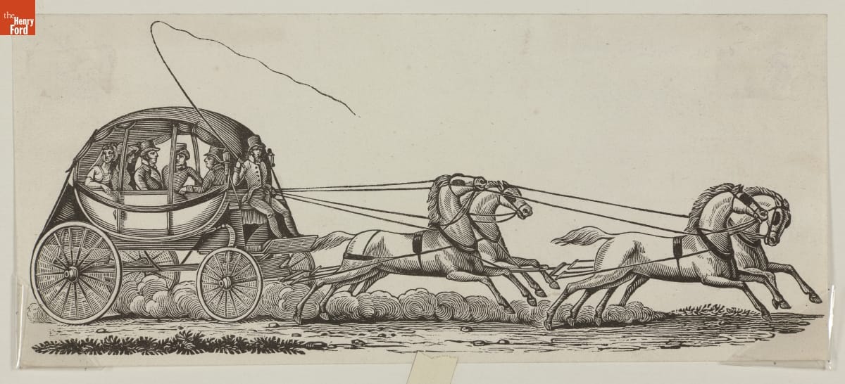 Before railroads, long-distance travelers often rode in public coaches. They would jostle along rough country roads with mail, freight, and other passengers "in stages," stopping every few hours to change horses. This image depicting a loaded stagecoach in transit was drawn and engraved by Philadelphia artist Alexander Robb.