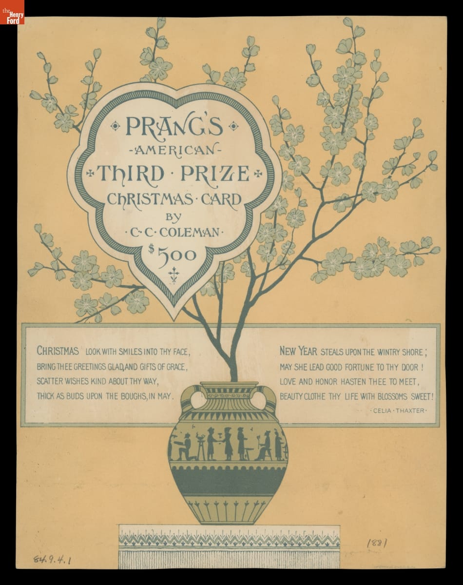 Beginning in the mid-1870s, Louis Prang, a German immigrant printer based in Boston, Massachusetts, created colorful chromolithographed Christmas cards. Prang later initiated a Christmas card design contest for American artists, where he would reproduce and sell the winning entries to eager consumers. Four contests were held from 1880 to 1884. This card shows one of the winning designs for 1881.