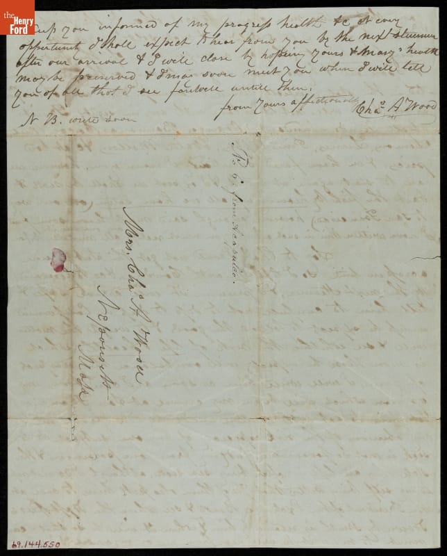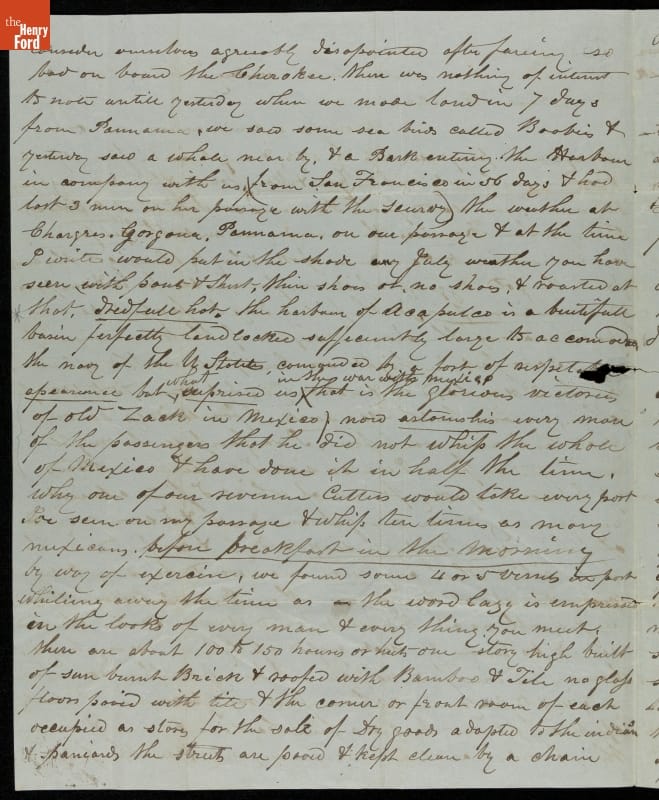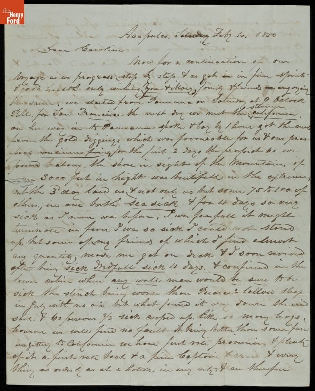 Letter from Charles A. Wood to his wife, Caroline Wood in Neponsett, Massachusetts, dated Acapulco, Mexico, February 10, 1850, describing his voyage from Panama to Acapulco undertaken as part of his journey to California. He describes in detail his voyage including the outbreak of seasickness among the passengers; gives the latest word from the California gold fields which was received from the steamship California out of the port of San Francisco; and describes the city of Acapulco.