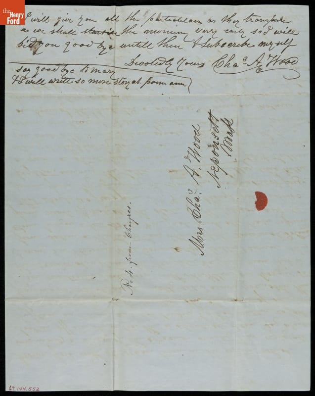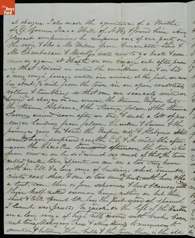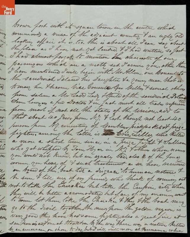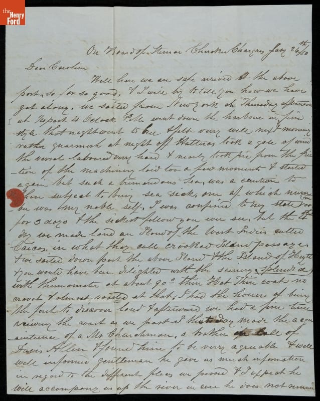 Letter from Charles A. Wood to his wife, Caroline Wood in Neponsett, Mass., dated on board the Steamship "Cherokee" at the port of Chargres (Chagres), Panama, January 26, 1850, concerning the first leg of his trip from New York to the California gold fields by way of Panama. He tells of the people he has met, including Mr. Chamberlain, Mr. Churchman, Mr. Wilder, David Allen (U.S. Consul to the Sandwich Islands), George Welles, and Chris Lilley, a Prizefighter, among others; the ships they have passed, including the Caicos, Empire City, Alabama, Falcon and Severn. He also describes in detail the port of Chagres and the conditions onboard the Cherokee, and gives the latest word from California (i.e., a fire at San Francisco and a murder at Stockton).
