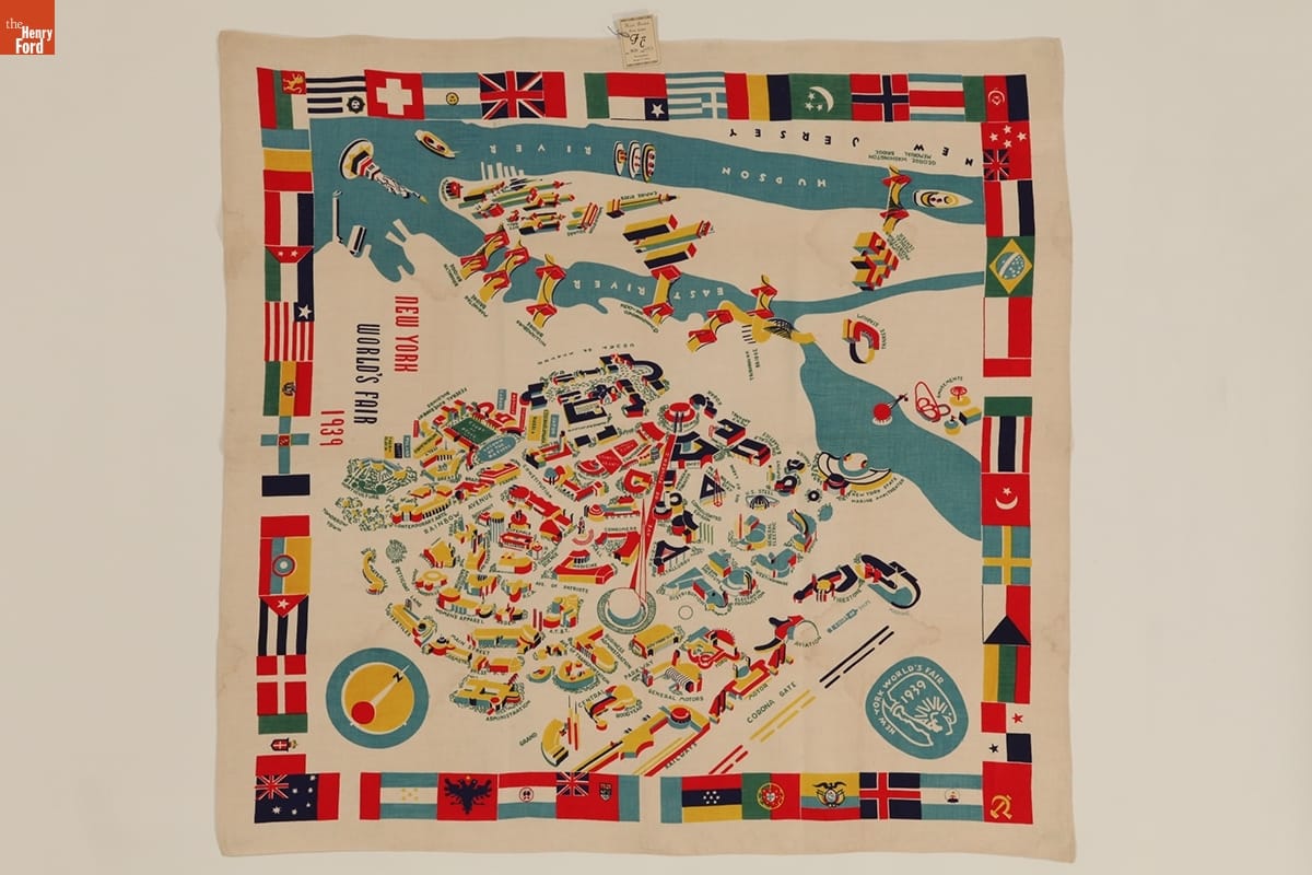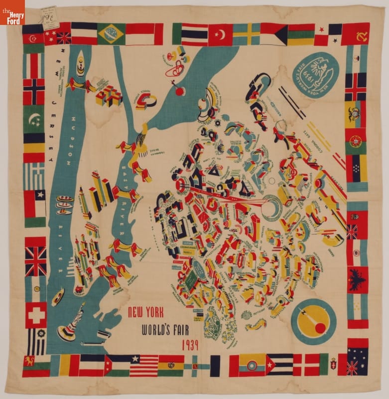 The 1939-40 New York World's Fair - themed "Building the World of Tomorrow" - encouraged a depression-weary public that the future would be rosy. The fair in New York City's Flushing Meadows-Corona Park attracted 45 million visitors. Many fairgoers returned home with souvenirs, such as this colorful tablecloth depicting the fairgrounds.