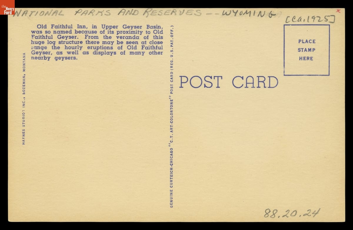 Old Faithful Inn and Geyser, Yellowstone National Park, 1935