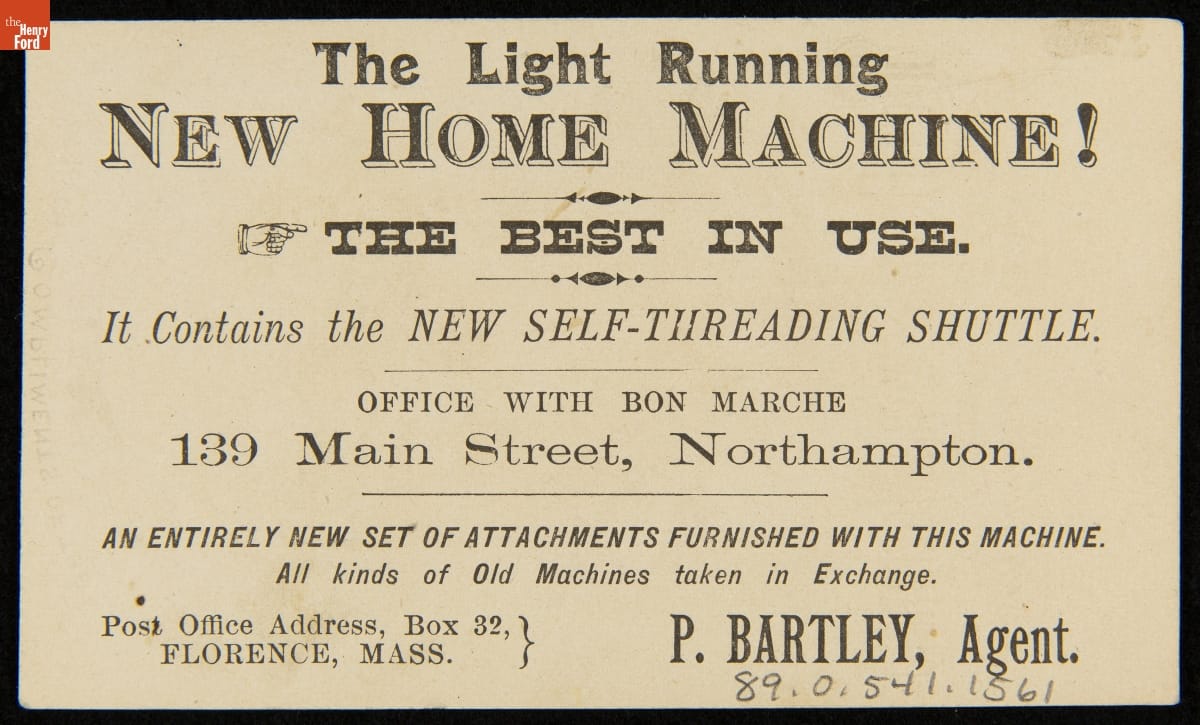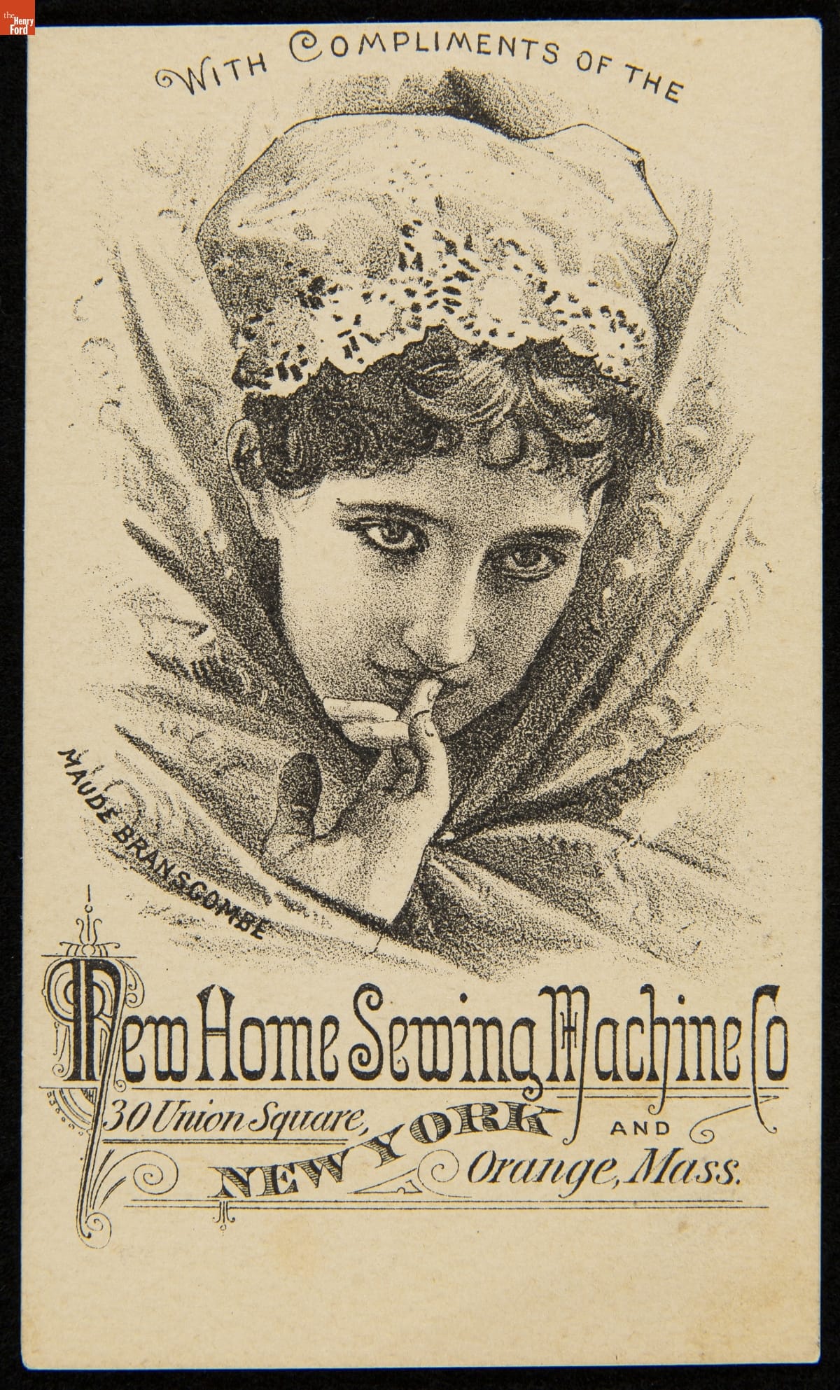Trade Card for the Light Running Home Shuttle Sewing Machine with Compliments of Maude Branscombe, New Home Sewing Machine Co., 1882-1890