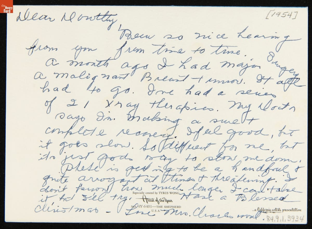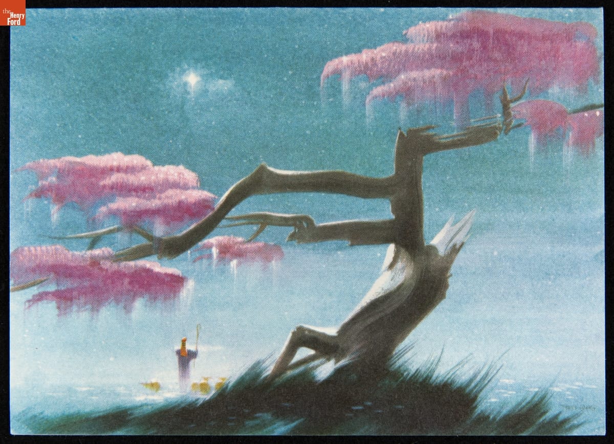 Tyrus Wong (1910-2016) came to America from China with his father in 1919. Wong studied to become an artist and worked in a variety of media. He worked briefly for Disney, creating the now-famous atmospheric backgrounds for Bambi. Later, Wong worked as a production illustrator for Warner Brothers. In the 1950s, he began designing Christmas cards. Ever-creative, Wong made kites in retirement.