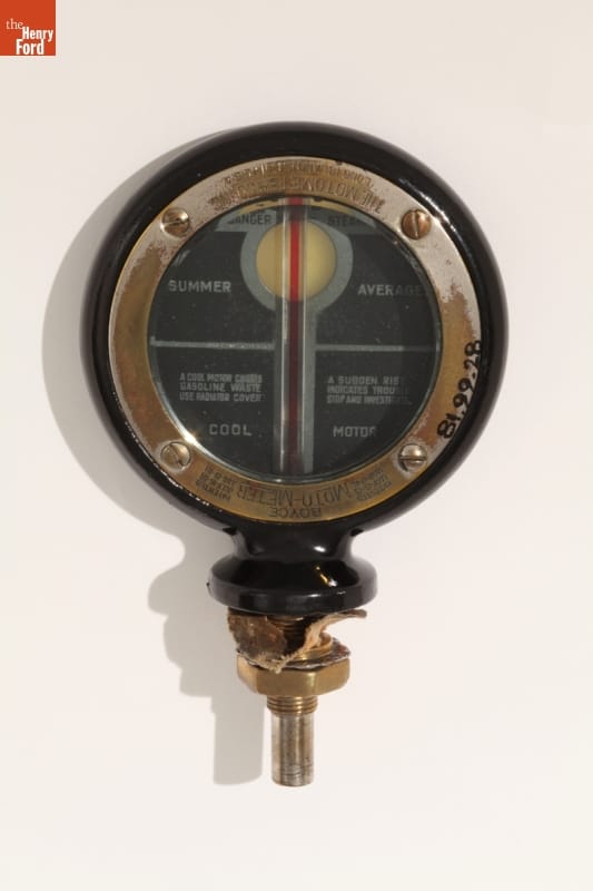Automobiles often came without temperature gauges before the early 1930s, so enterprising manufacturers sold aftermarket motometers. Mounted on a car's radiator, these devices measured and displayed coolant water vapor temperature, notifying drivers if their automobiles were in danger of overheating. Moto-Meter Co. Inc. dominated the American market, producing the popular Boyce motometer and others featuring an automotive manufacturer's name or logo.