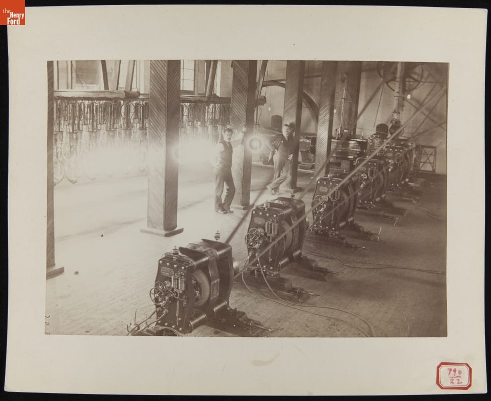 James J. Wood, electrician and mechanical engineer of the Fort Wayne Electric Corporation (right), and Arthur L Hadley, his assistant (left), stand in the arc lamp and dynamo testing department of the company's factory. Talented inventors like Wood helped the Fort Wayne, Indiana, business compete against other electric lighting equipment manufacturers. The company would eventually become a part of General Electric.