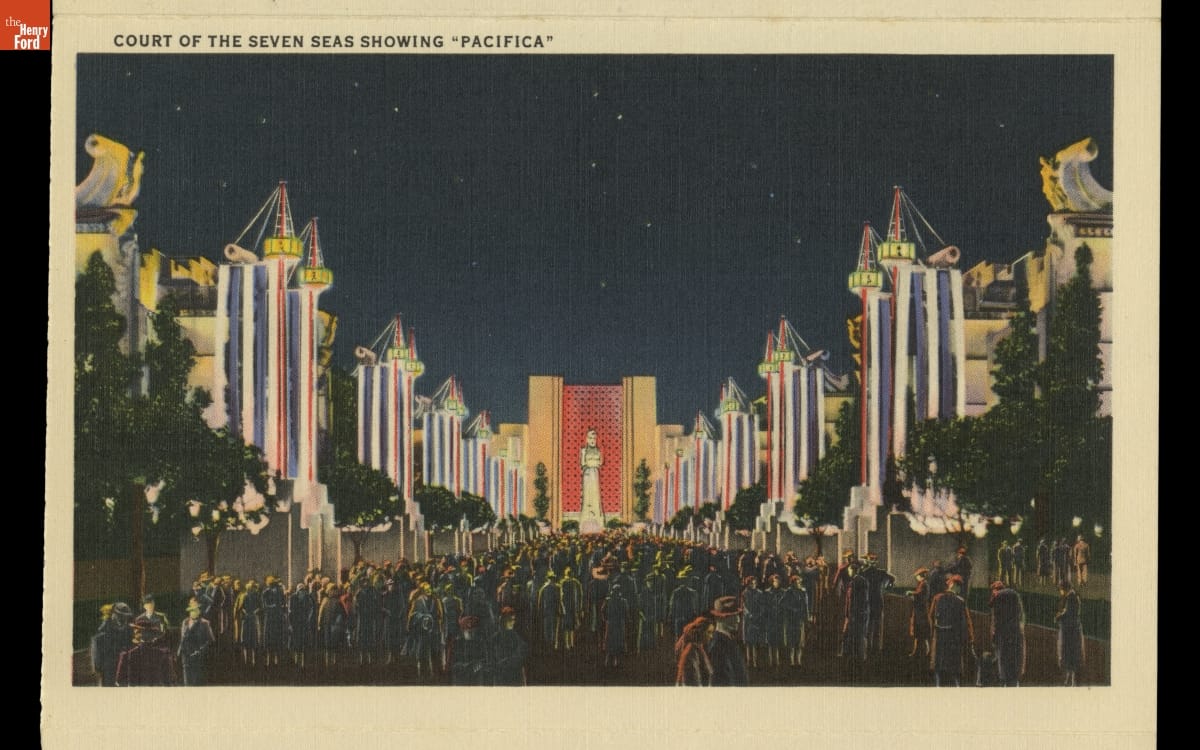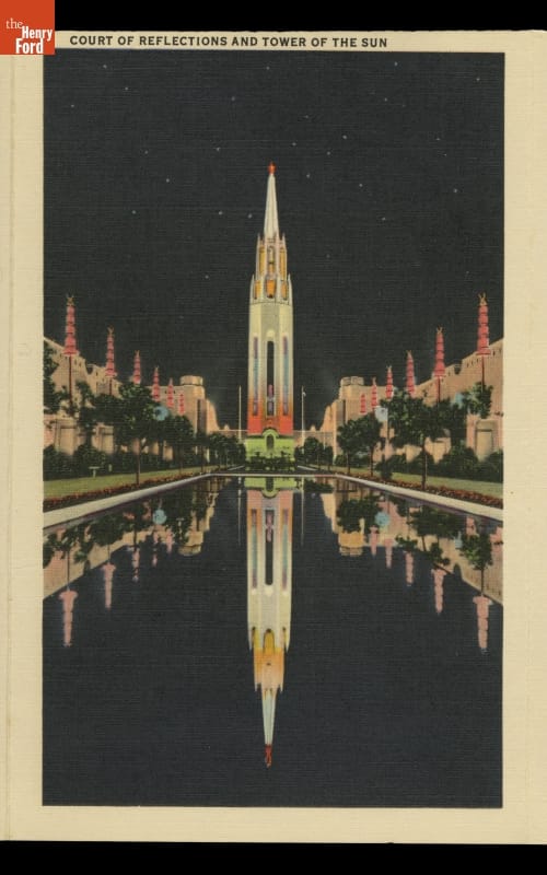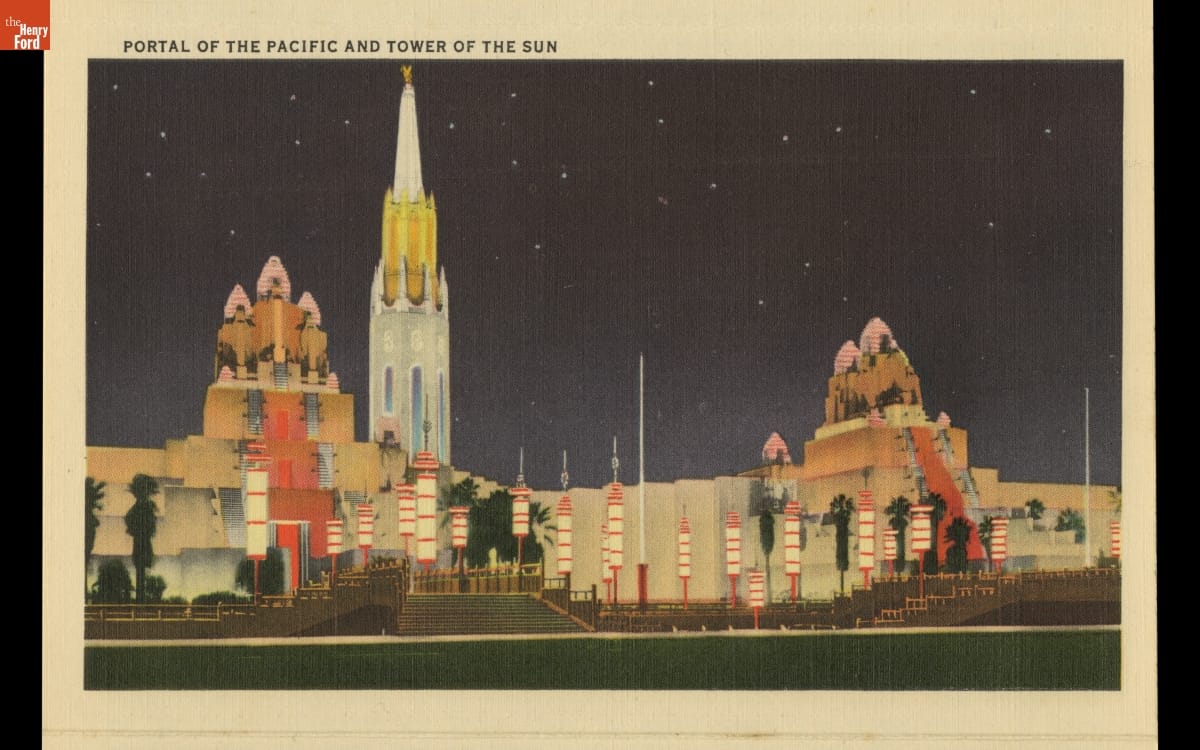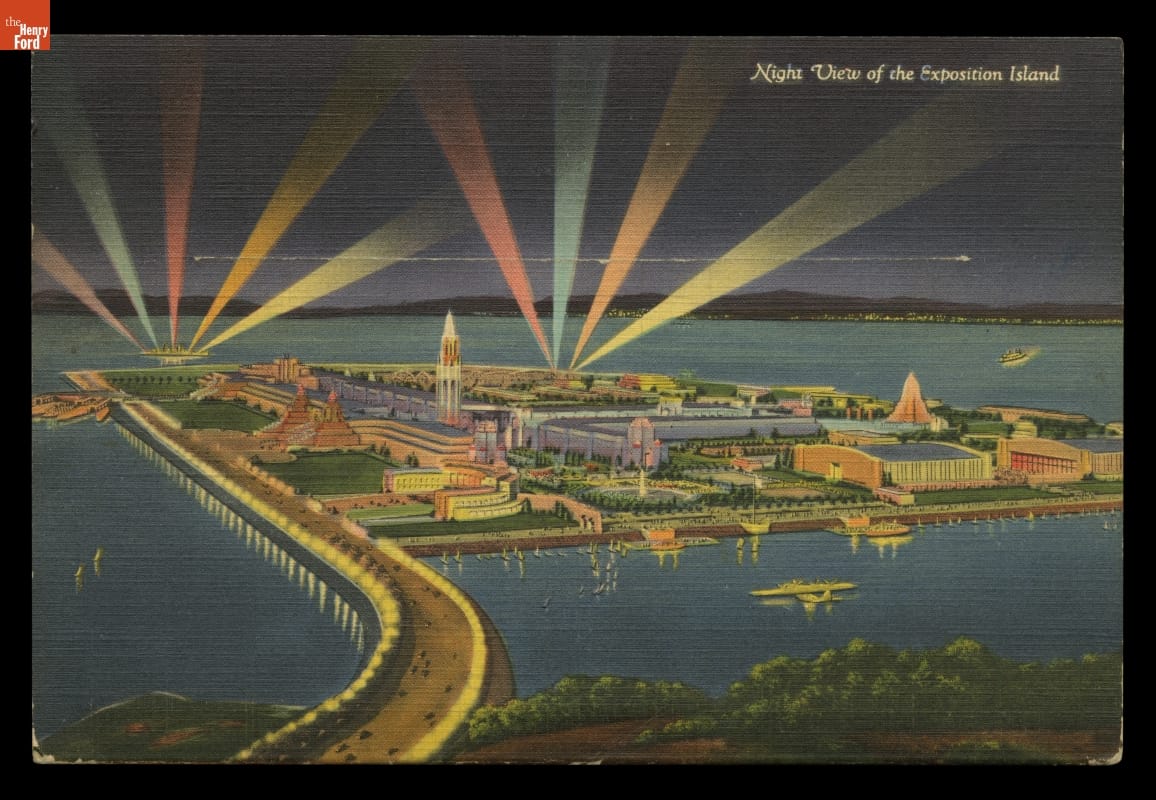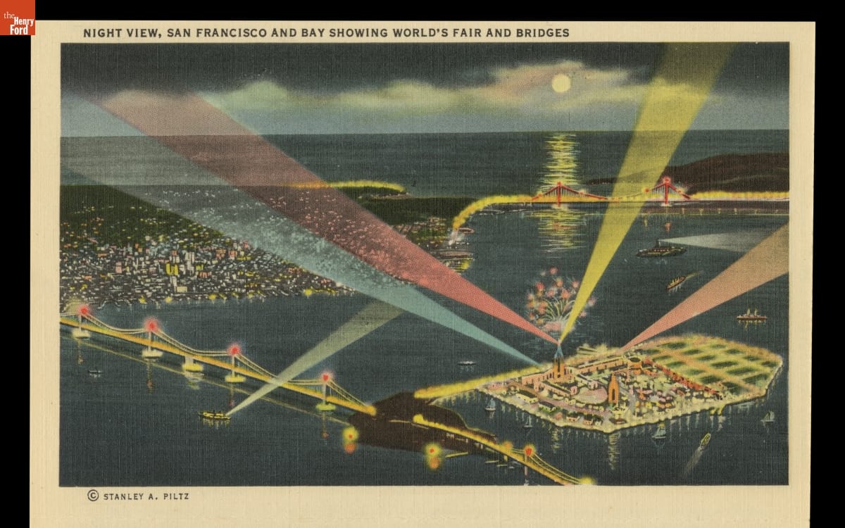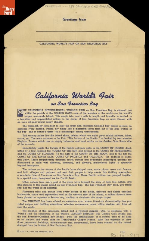 The 1939-1940 Golden Gate International Exposition -- noted here as the California World's Fair on San Francisco Bay -- showcased the nations of the Pacific Rim and celebrated the completion of the Golden Gate and Oakland Bay Bridges. Millions of fairgoers flocked to the man-made Treasure Island to visit the fair. Many returned home with souvenirs, like this packet of 18 fold-out postcard images.