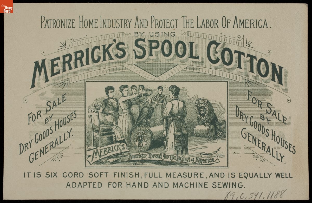 As color printing gained momentum in the late 19th century, trade cards became a major means of advertising goods and services. Americans enjoyed and often saved the little advertisements found in product packages or distributed by local merchants. This trade card advertises Six Cord Soft Finish Spool Cotton by Merrick Thread Company.