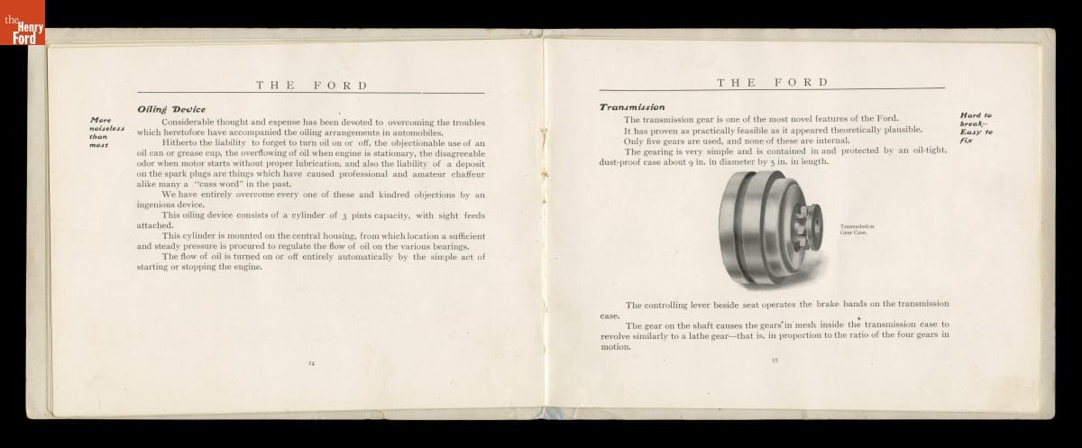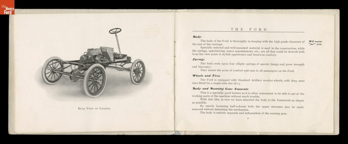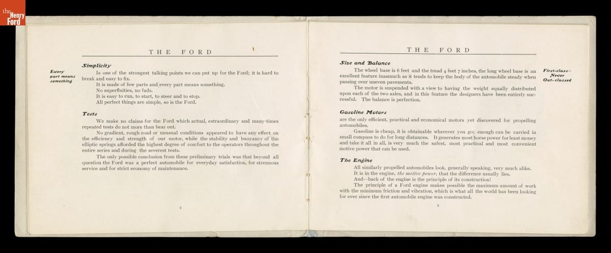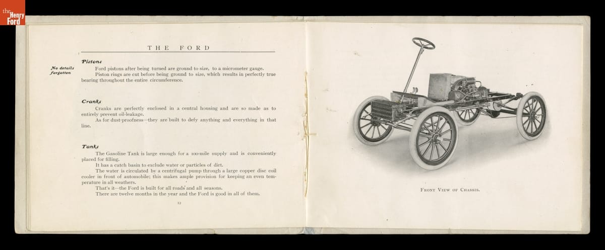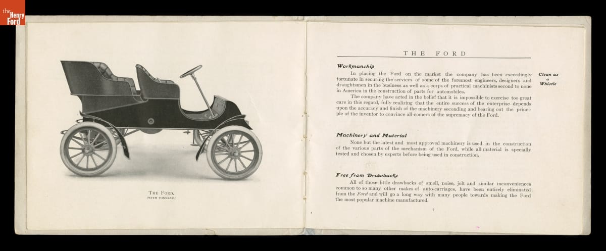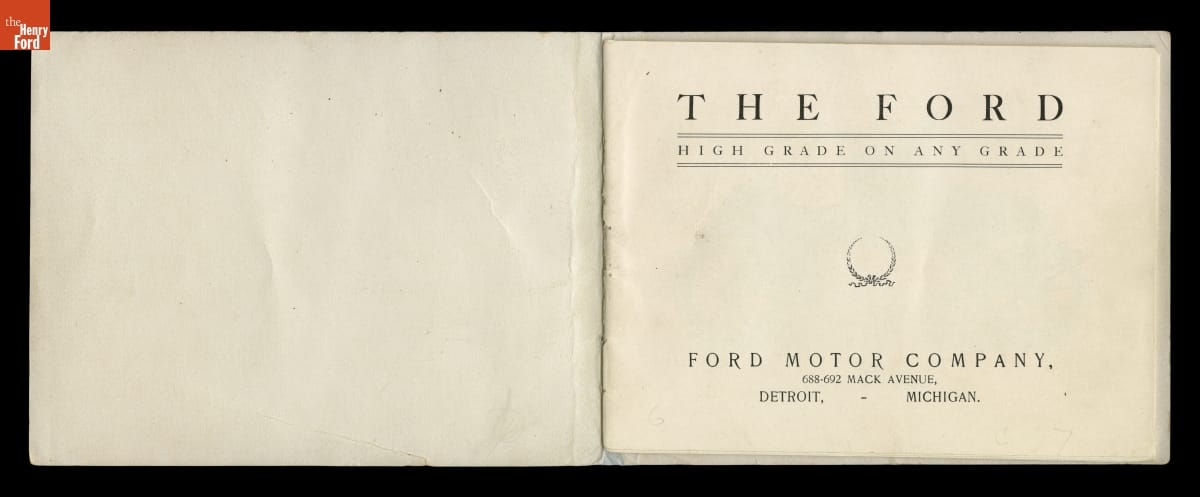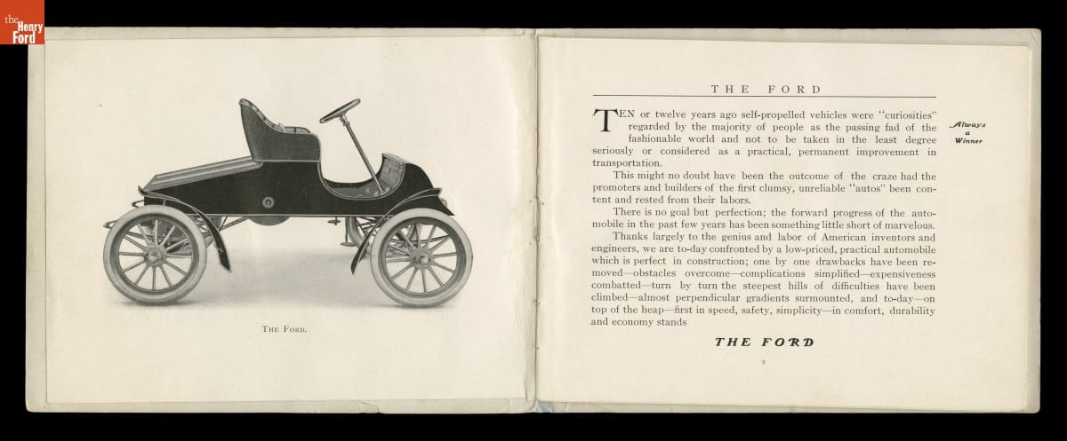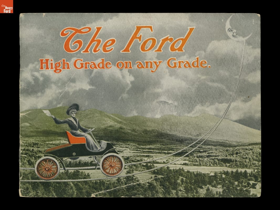 Henry Ford wanted to create a light-weight, low-priced vehicle. His automobile would be uncomplicated, able to traverse American roads, and affordable to average Americans. The Ford Motor Company's first vehicle -- simple and inexpensive -- is seen headed to the moon on the cover of this 1903 catalog. Ford, however, was not satisfied and continued to improve and innovate.