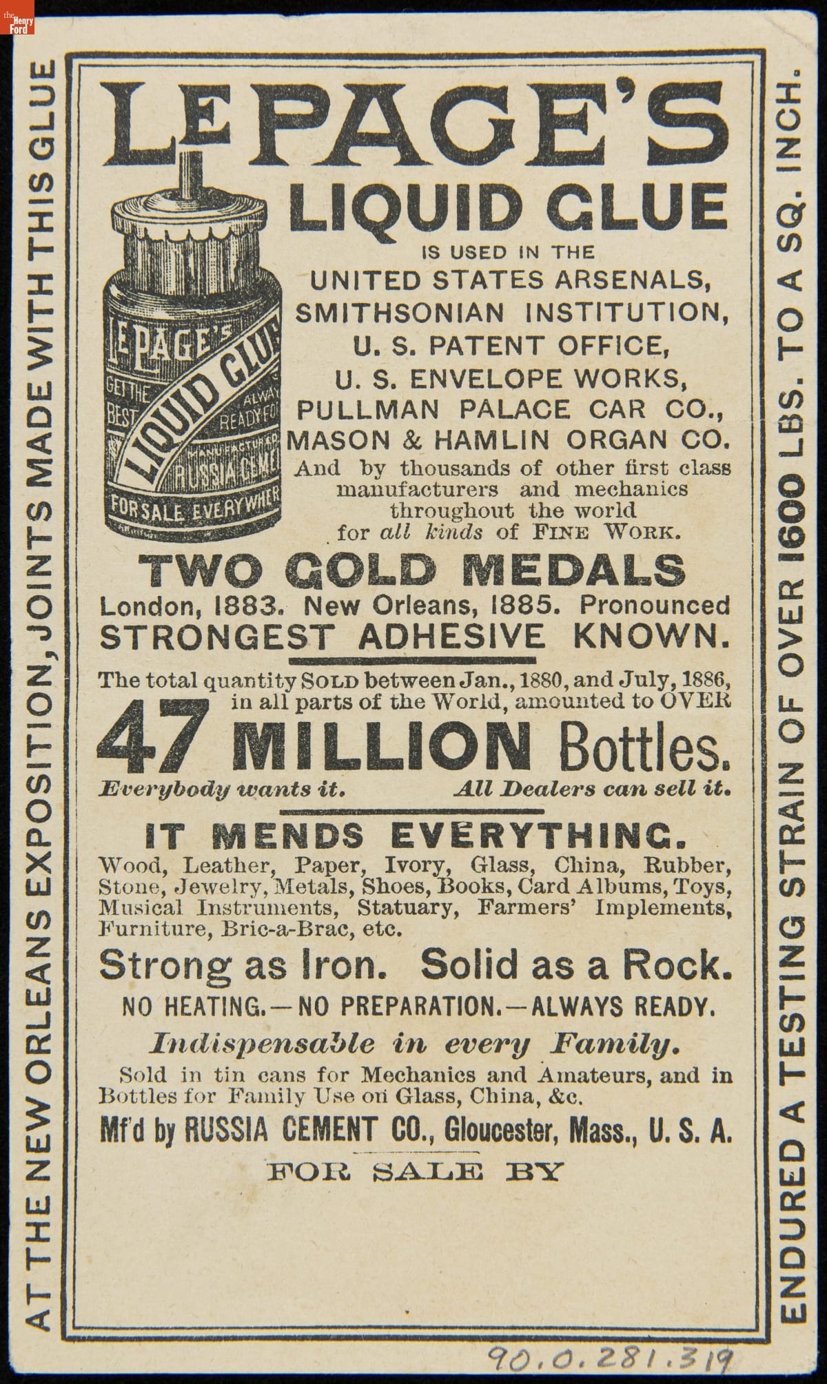 Trade Card for LePage's Glue, Russia Cement Co., 1886-1888
