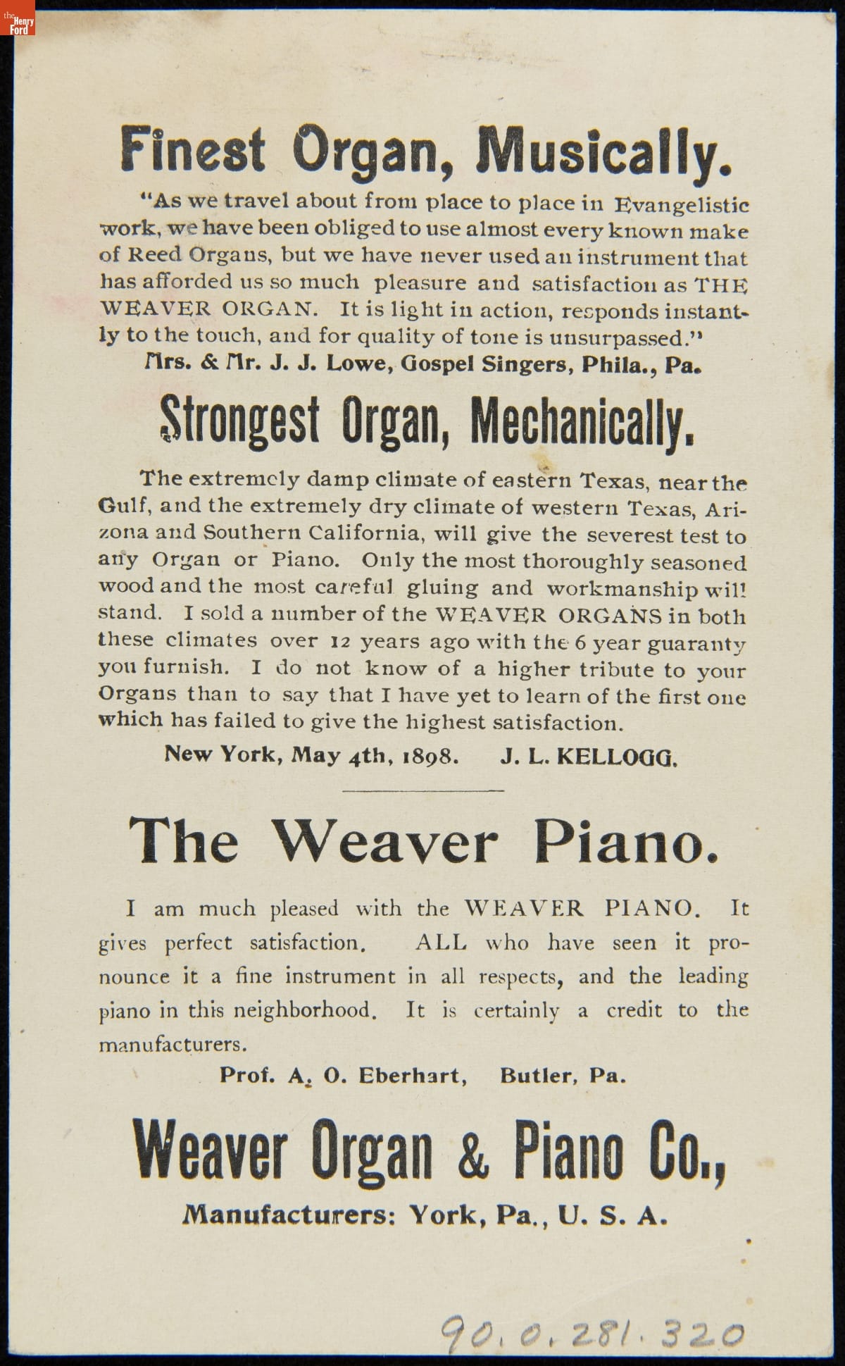 Manufactured by Weaver Organ and Piano Company, York, Pennsylvania.