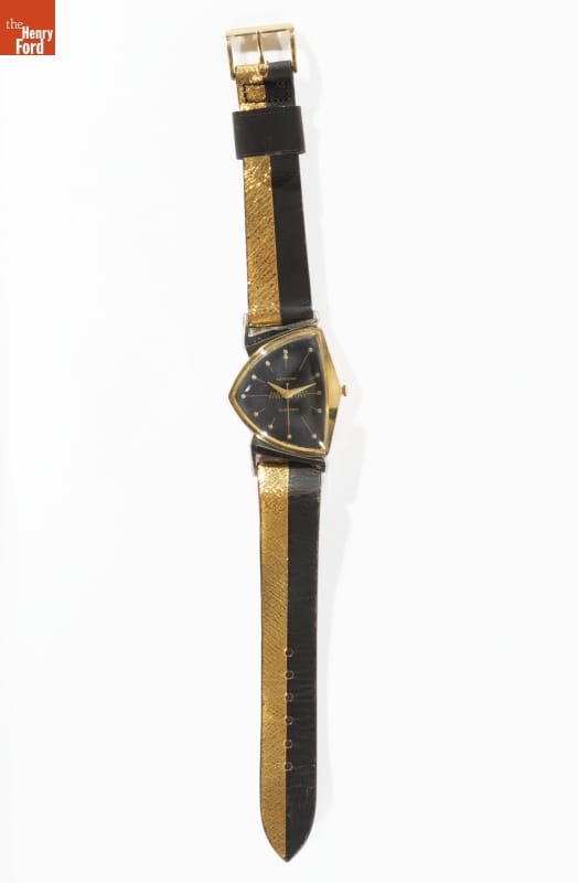 When this watch came to the Museum in 1959, the Hamilton Watch Company was America's leading watchmaker. The company created the first electric watch, the Ventura, whose movement was powered by a battery, instead of a wound spring. Its design was as revolutionary as the mechanism--the lozenge-shaped case reflected postwar American industrial design. This watch has the Ventura's watchband but the features of its successor, the Pacer.