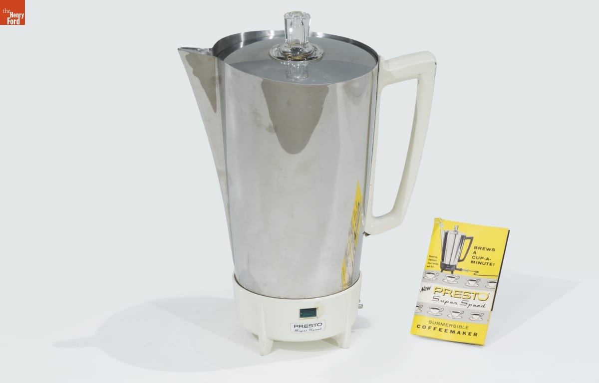 Electric appliance manufacturer National Presto Industries, Inc., became known for innovative products that anticipated and responded to evolving consumer needs. Presto introduced the first automatic stainless steel coffee maker that was fully submersible--designed to be washed safely, completely under water--in 1958. In the 1960s and 1970s, distinctive styling by Mel Boldt and Associates helped set Presto's coffee makers apart from the competition.