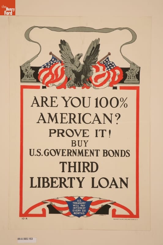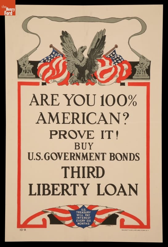 Print reads: ARE YOU 100% AMERICAN? PROVE IT! BUY U.S. GOVERNMENT BONDS THIRD LIBERTY LOAN