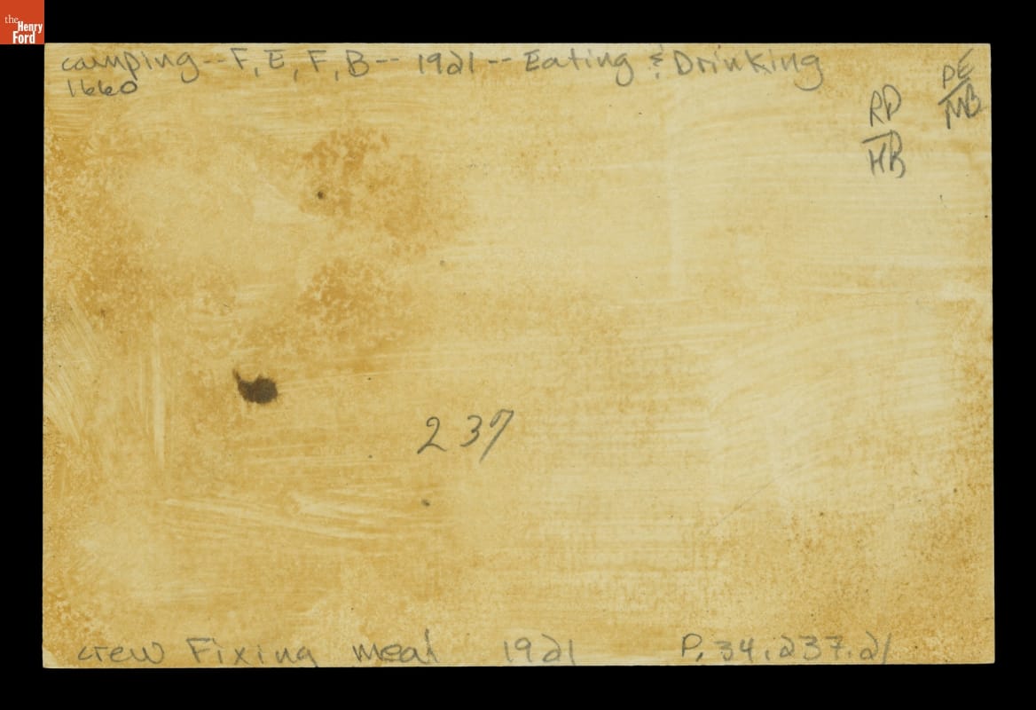 Between 1916 and 1924, Henry Ford, Thomas Edison, Harvey Firestone and John Burroughs embarked on a series of camping trips. They called themselves the Vagabonds, but they camped in style. Numerous support staff set up and took down camp, cooked, took photographs, and maintained the cars and equipment trucks. This photograph shows chefs Fisher and Herman cooking for the group in 1921.