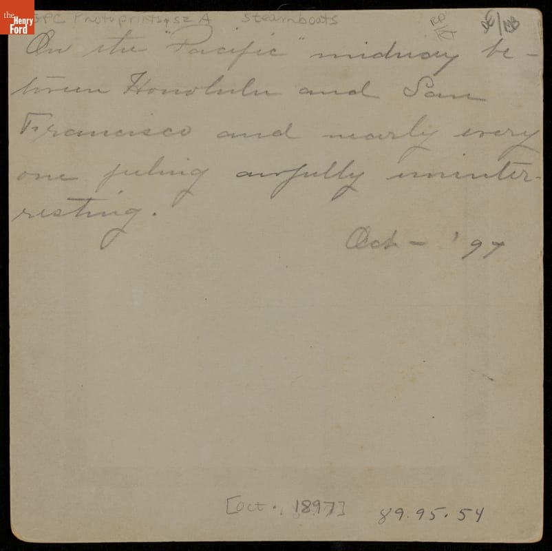 Writing in pencil on back reads: On the "Pacific" midway between Honolulu and San Francisco and nearly everyone feeling awfully uninteresting. Oct-'97