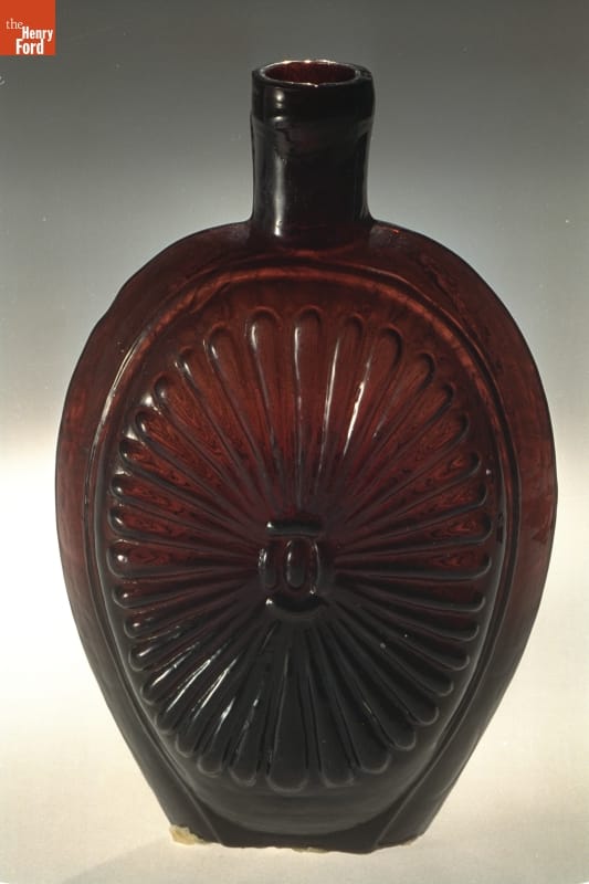 Glass factories in America began producing inexpensive, mold-formed flasks in the early 1800s. These figured flasks, often embellished with symbols of national pride or political or cultural affiliation, appealed to America's common man. Purely decorative flasks, however, were another option. These flasks -- like this sunburst-pattern one -- held alcohol just as well as those with images of great men or patriotic emblems.