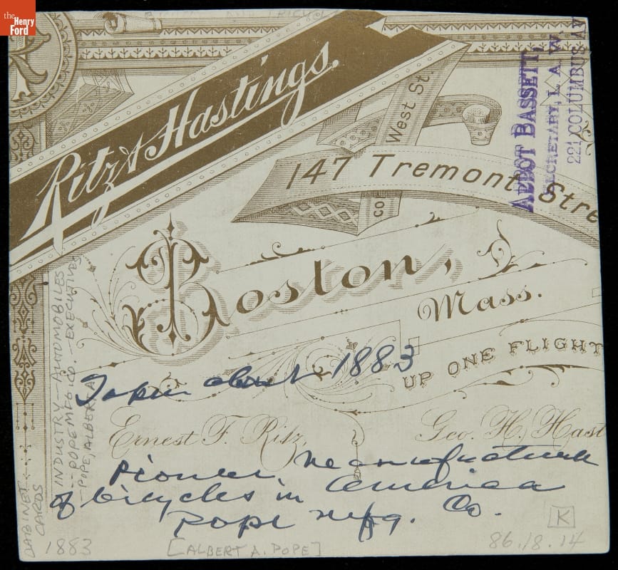Albert Pope began manufacturing bicycles after seeing a high-wheel ordinary at the Centennial Exhibition in Philadelphia. In 1877, he formed Pope Manufacturing Company and churned out thousands of bicycles each year. The Civil-War-officer-turned-entrepreneur also helped sponsor the League of American Wheelmen to advocate for good roads -- something every cyclist (and bicycle maker) desired.