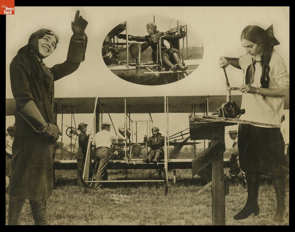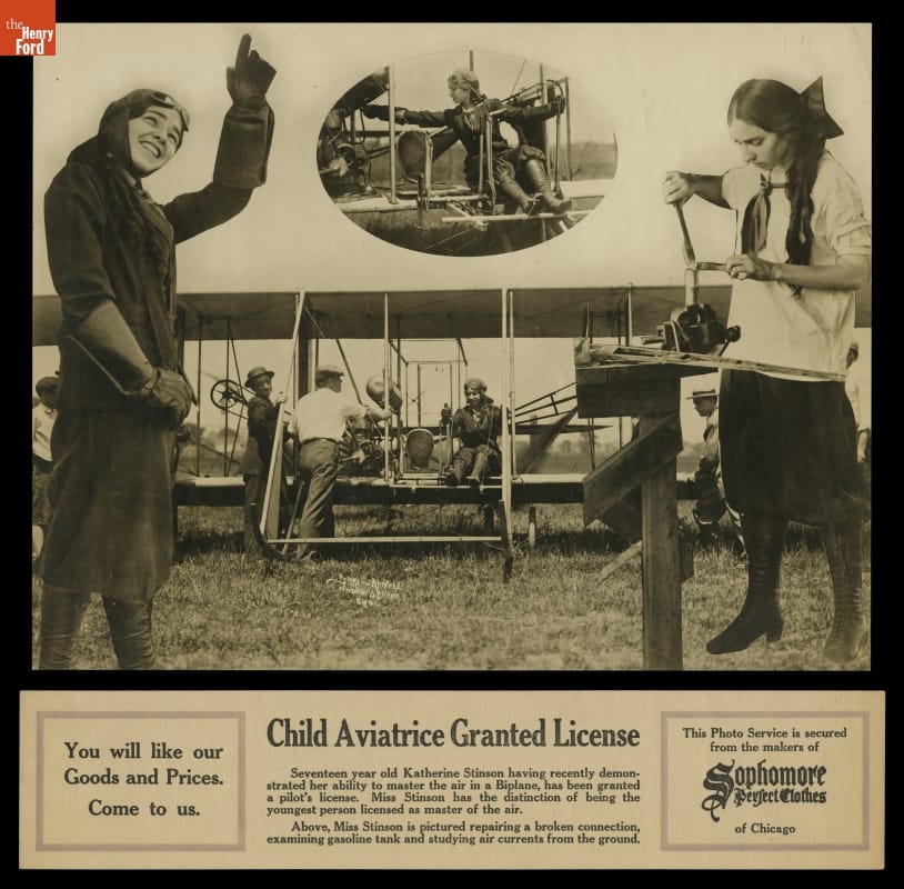 Despite her petite stature, Katherine Stinson was among the most skilled exhibition pilots in the world in the 1910s. The press dubbed her the "Flying Schoolgirl," and audiences were wowed by her abilities. This advertisement played loose with the facts -- Stinson was born in 1891 and earned her pilot's license in 1912, when she was 21 years old.