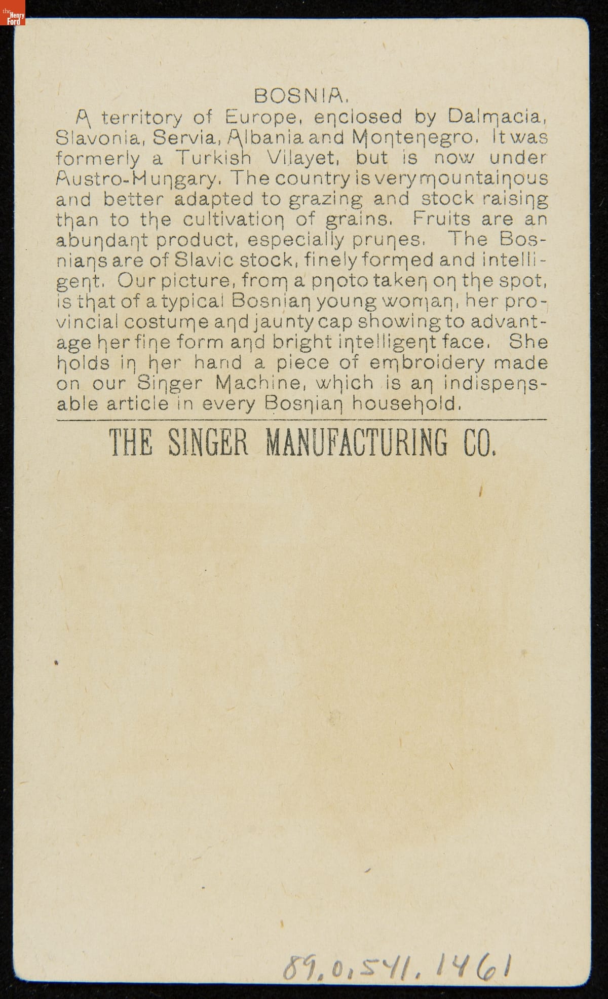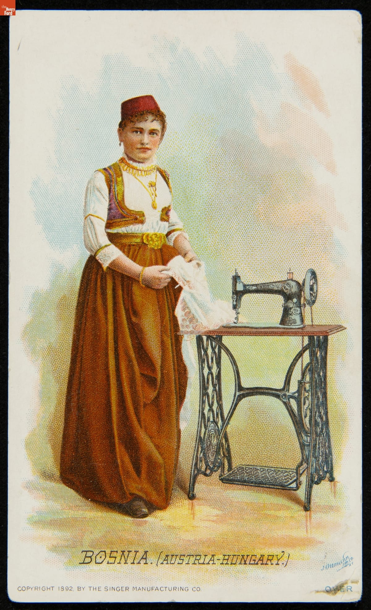As color printing gained momentum in the late 19th century, trade cards became a major means of advertising goods and services. Americans enjoyed and often saved the vibrant little advertisements found in product packages or distributed by local merchants. The Singer Sewing Machine Company had a series of trade cards, like this one, offering images of Singer machine users from around the world in their national dress.