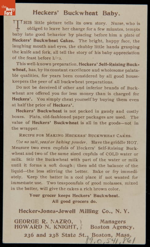 Trade Card for Hecker's Buckwheat, Hecker-Jones-Jewell Milling Co., 1893