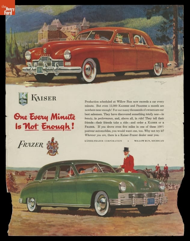 Henry Kaiser and Joseph Frazer formed their automobile company in 1945 to take advantage of the post-World War II seller's market. They established production at Willow Run, Michigan, in the same plant where Ford had built B-24 bombers during the war. After a promising start, Kaiser-Frazer sales fell. The company left the passenger car market in 1955.