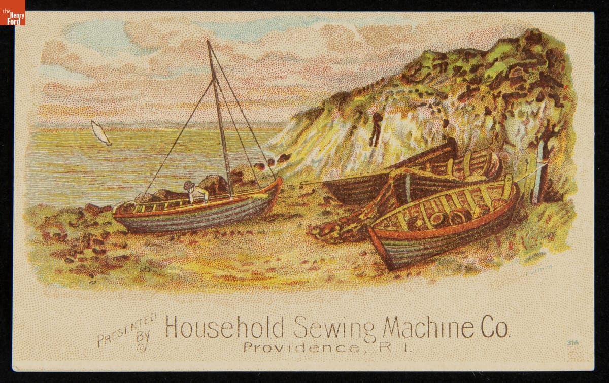 As color printing gained momentum in the late 19th century, trade cards became a major means of advertising goods and services. Americans enjoyed and often saved the little advertisements found in product packages or distributed by local merchants. This trade card advertises the Household Sewing Machine Company.