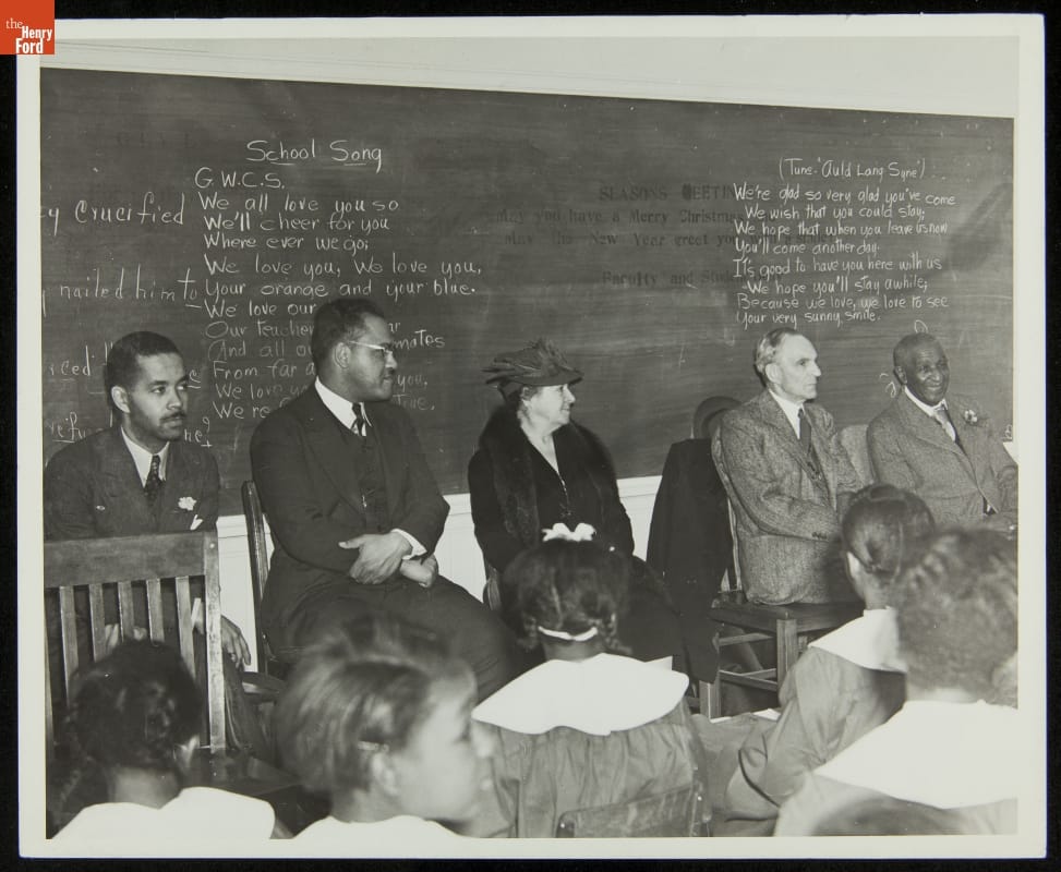 Henry Ford honored his friend George Washington Carver by naming a school on his property in Georgia after Carver. Seated in a classroom at the 1940 dedication of the George Washington Carver School are, from left to right, Austin W. Curtis, Jr., Carver's assistant; Frederick D. Patterson, President of Tuskegee Institute; Clara Ford; Henry Ford; and Carver. On the chalkboard is a song dedicated to Henry Ford.