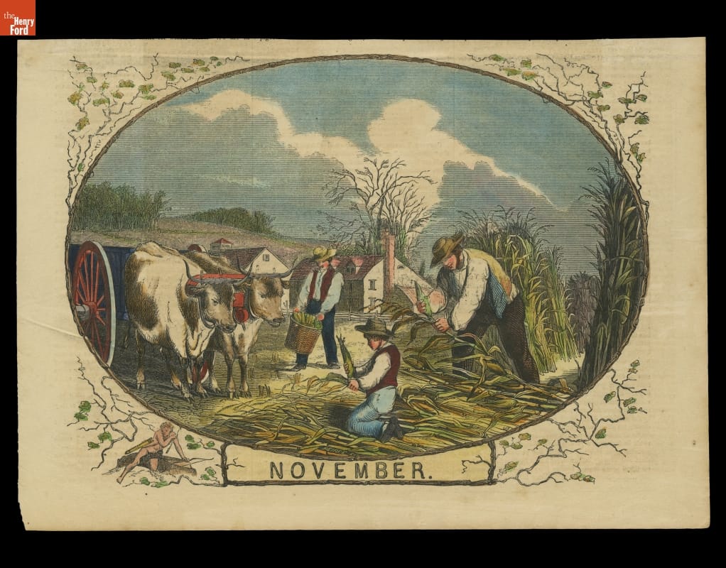 A mid-19th-century farm was full of activity all year round. Corn was harvested in the fall. Farmers chopped the cornstalks and set them in the fields. Later, the ears of corn were removed and transported to waiting barns or cribs. The kernels could be ground into meal; the stalks and husks were fed to livestock. Harvesting, like most farm work, was labor intensive and young and old were expected to help.