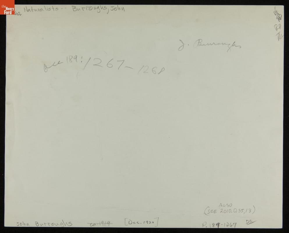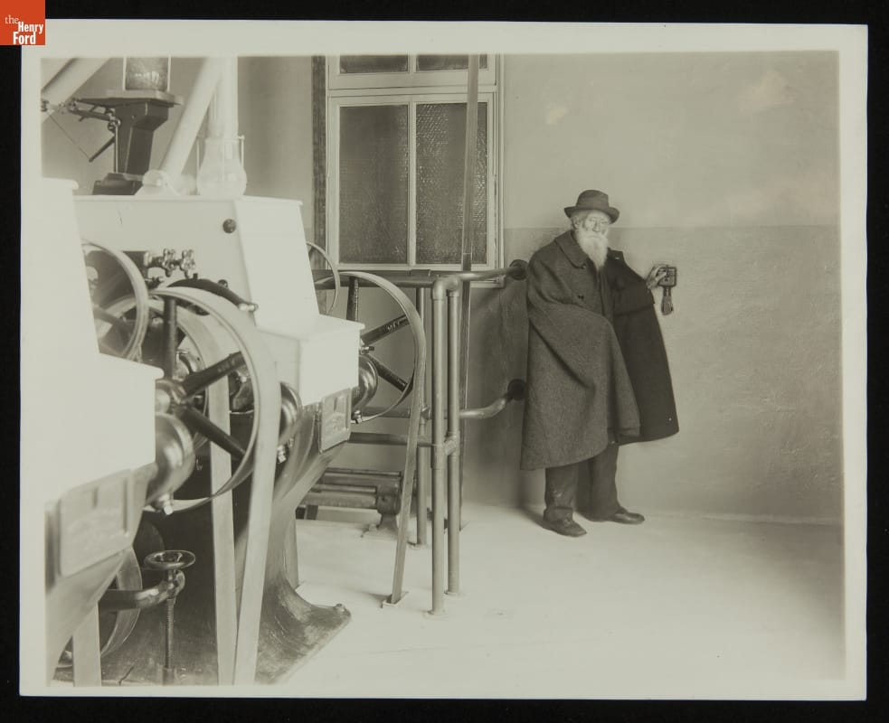 In the early 1910s, Henry Ford befriended John Burroughs, an internationally known naturalist and writer. The two bonded over their love of birds and nature. They visited and vacationed with each other regularly. In 1920, Burroughs passed through Dearborn and stopped at the Henry Ford Flour Mill. In this photograph, Burroughs is seen starting the mill's machinery for a trial operation.