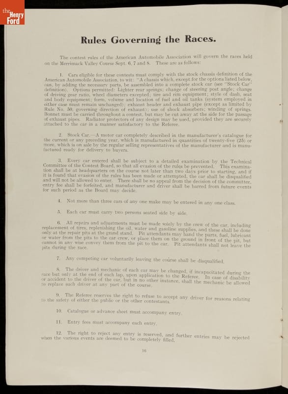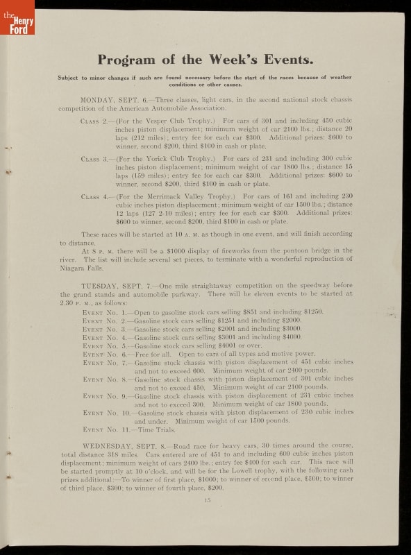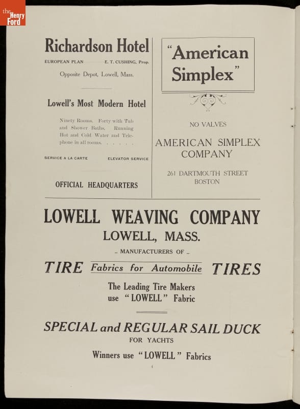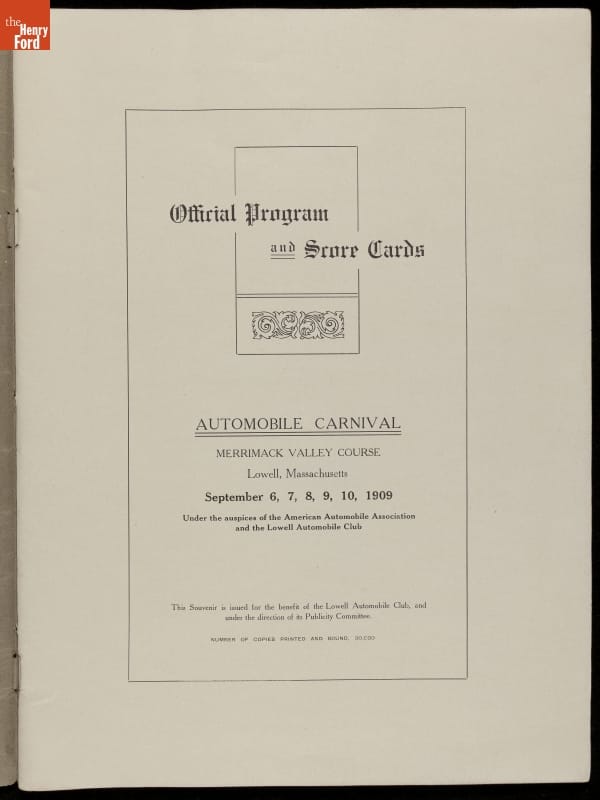 The OFFICIAL PROGRAM / MERRIMACK VALLEY COURSE / LOWEL, MASSACHUSETTS / Sept. 6, 7, 8, 9, 10, 1909 / ISSUED FOR THE AMERICAN AUTOMOBILE ASSOCIATION / LOWELL AUTOMOBILE CLUB / PRICE 10 CENTS